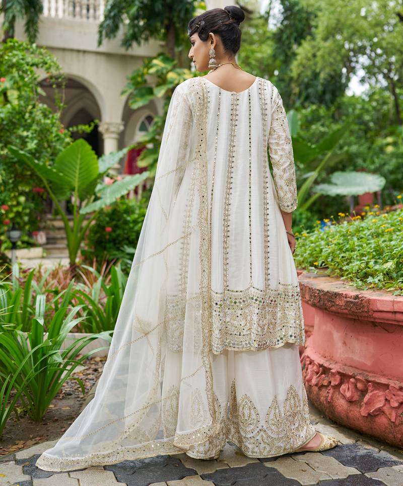 White real mirror chinon silk wedding party wear sharara salwar suit with net dupatta full stitched free size