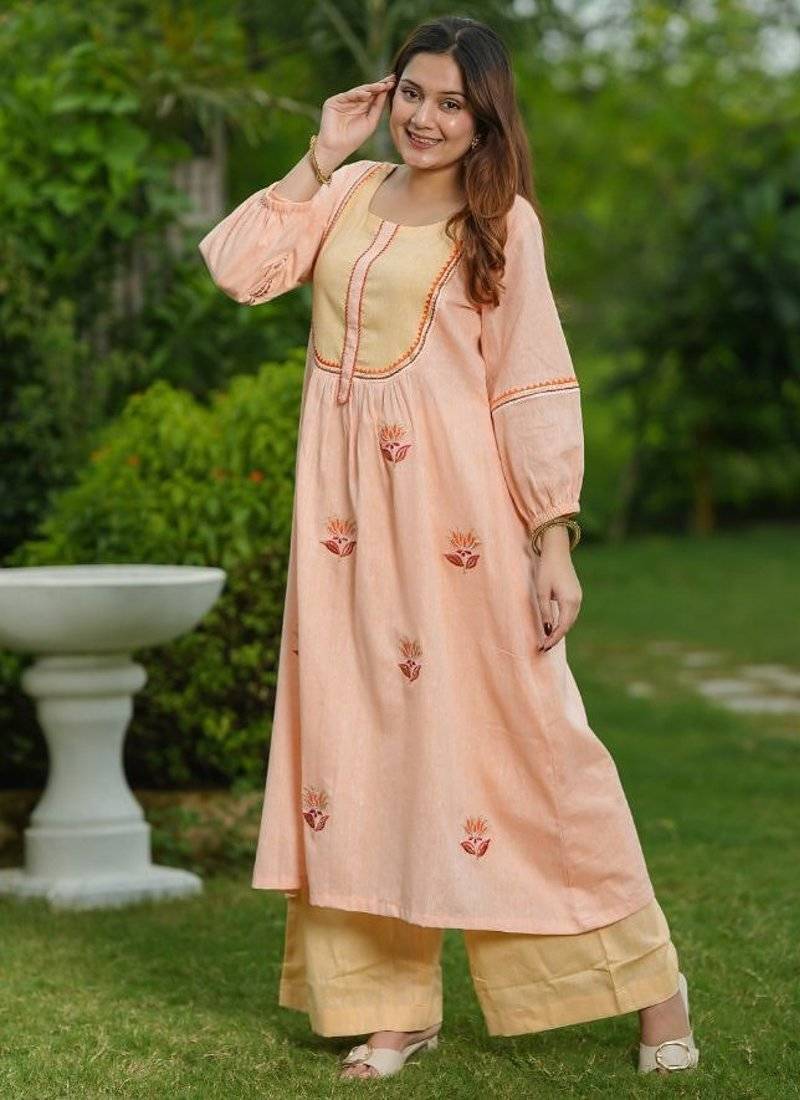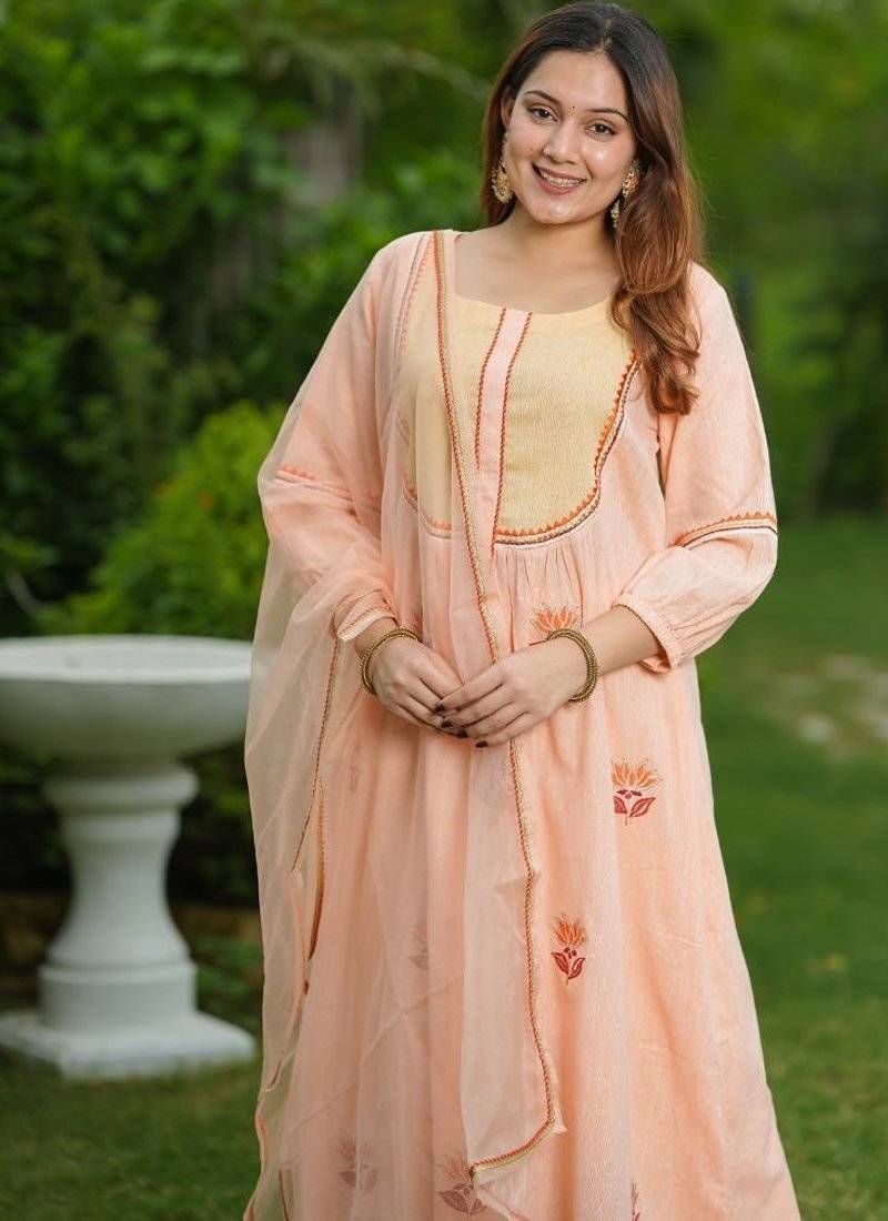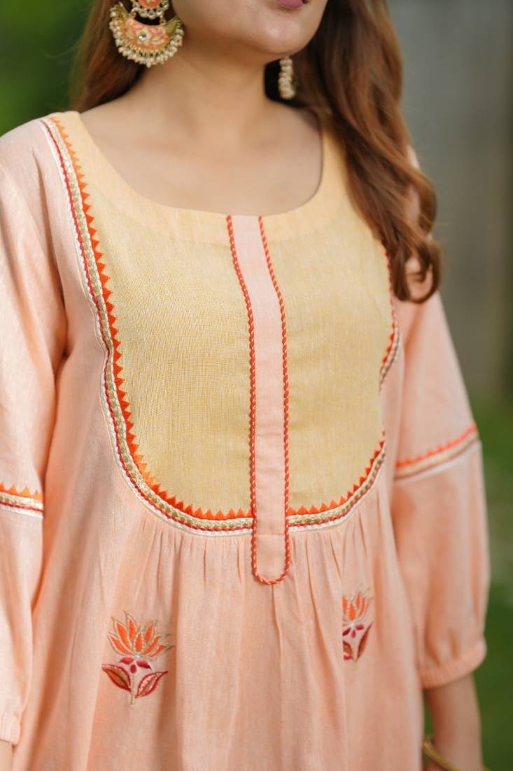 Product Description | Graceful, Refreshing And Soft, This Peach Lotus Cotton Suit Set Features Delicate Lotus Embroidery And A Dual Tone Yoke That Adds A Touch Of Elegance. Paired With Matching Pants And A Breezy Dupatta, It’s A Perfect Pick For Festive Charm And Elevate Special Occasions. |