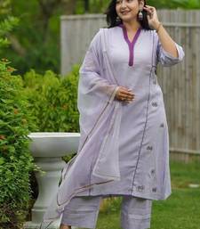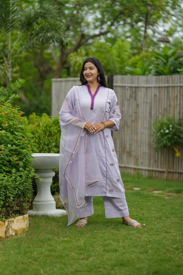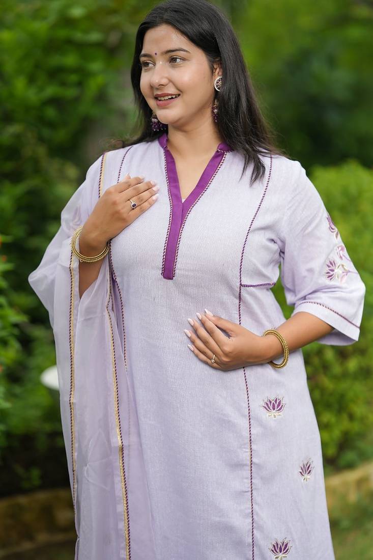 Product Description | Step Into Elegance With This Purple Hue Cotton Suit Set, Designed To Blend Comfort With Sophistication. The Soft Pastel Hue Exudes Calmness, While The Intricate Lotus Motifs Delicately Embroidered Along The Kurta Add A Touch Of Artistry And Charm. Paired With Straight Fit Cotton Pants And A Sheer Dupatta Adorned With Subtle Lotus Accents And Fine Detailing, This Suit Set Is A Perfect Choice For Festive And Outdoor Get Togethers. |