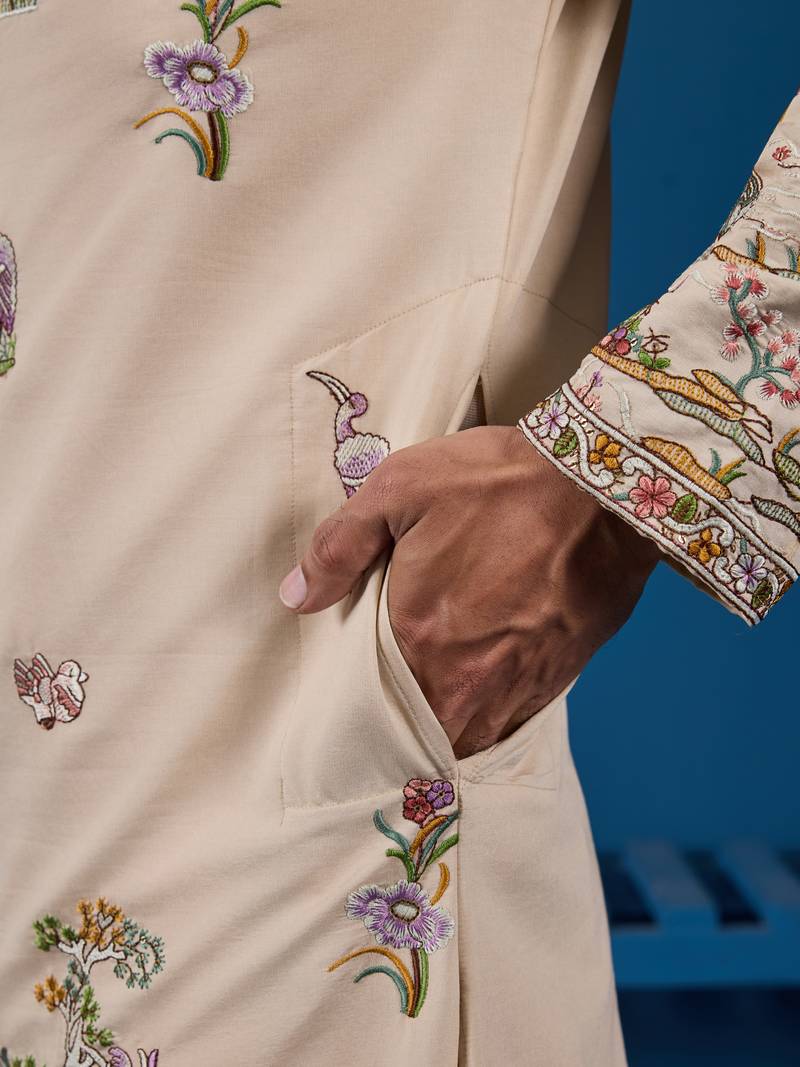 | Product Name | Beige Viscose Silk Thread & Sequins Embroidered Work Wedding Festival Marriage Function Party Wear Straight Mens Kurta | |