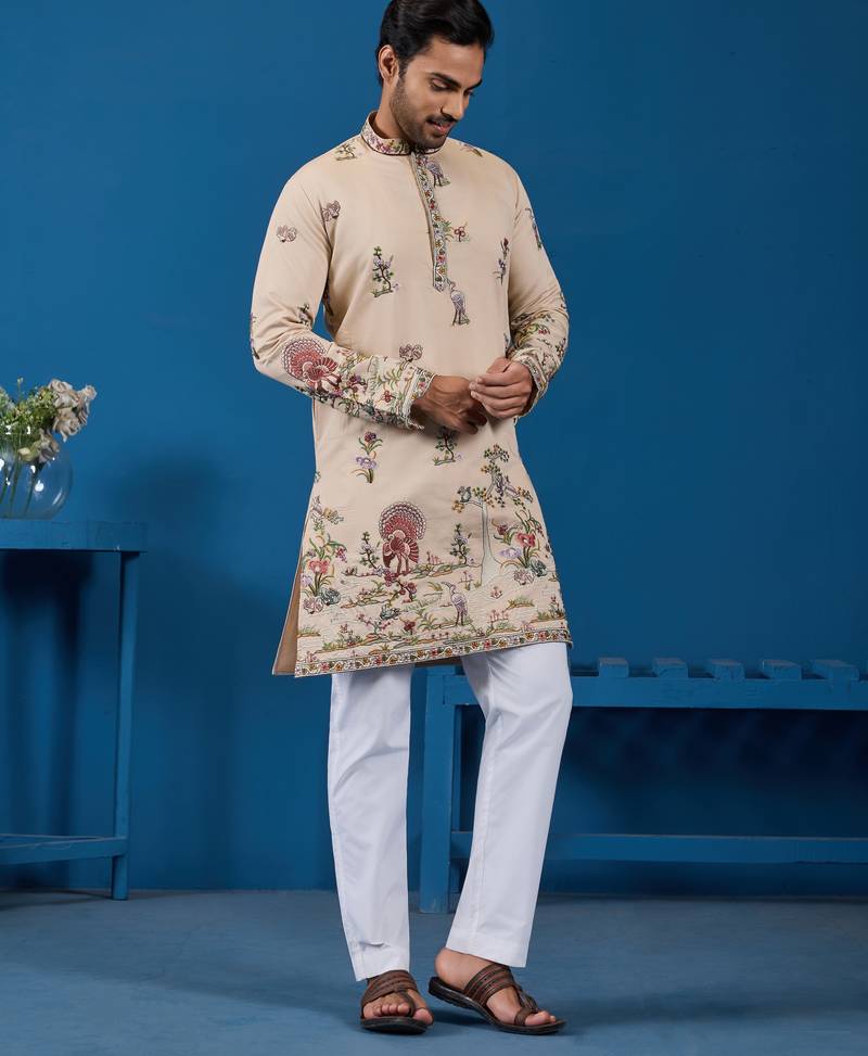 Beige viscose silk thread & sequins embroidered work wedding festival marriage function party wear straight mens kurta