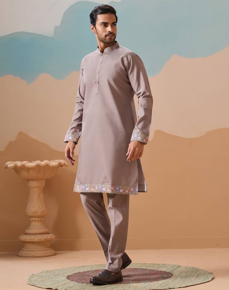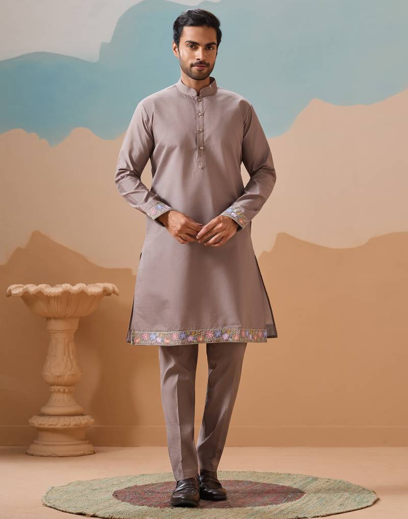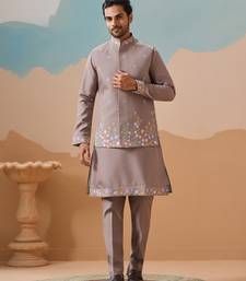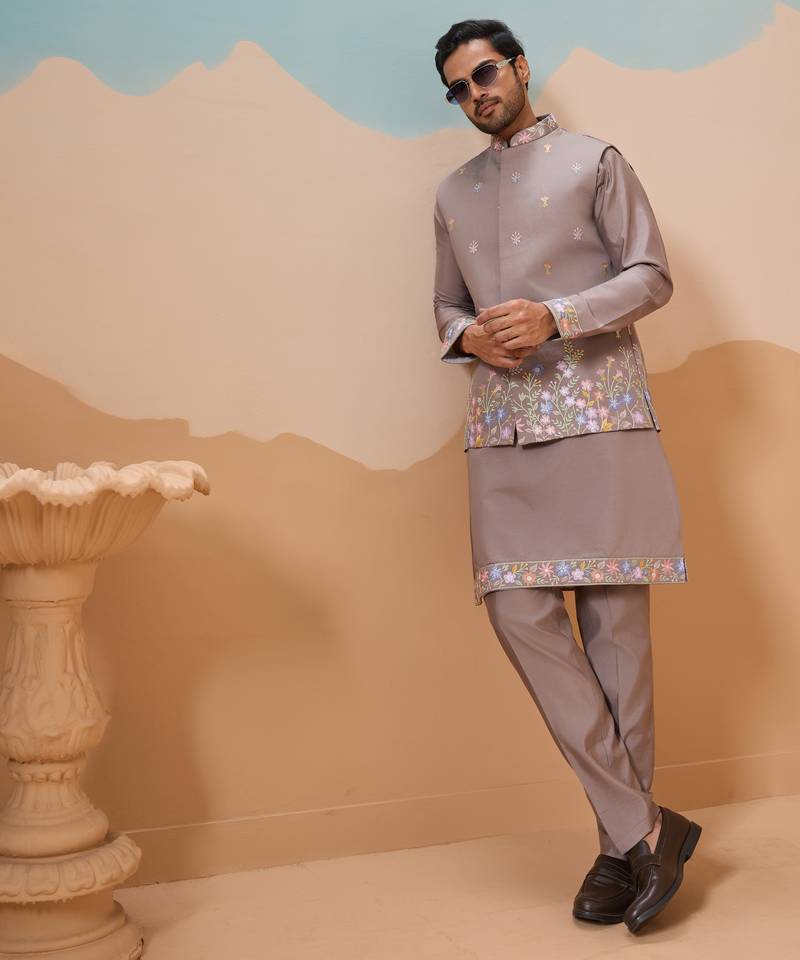 Grey viscose silk thread with sequins embroidered work wedding festival party wear straight kurta with jacket