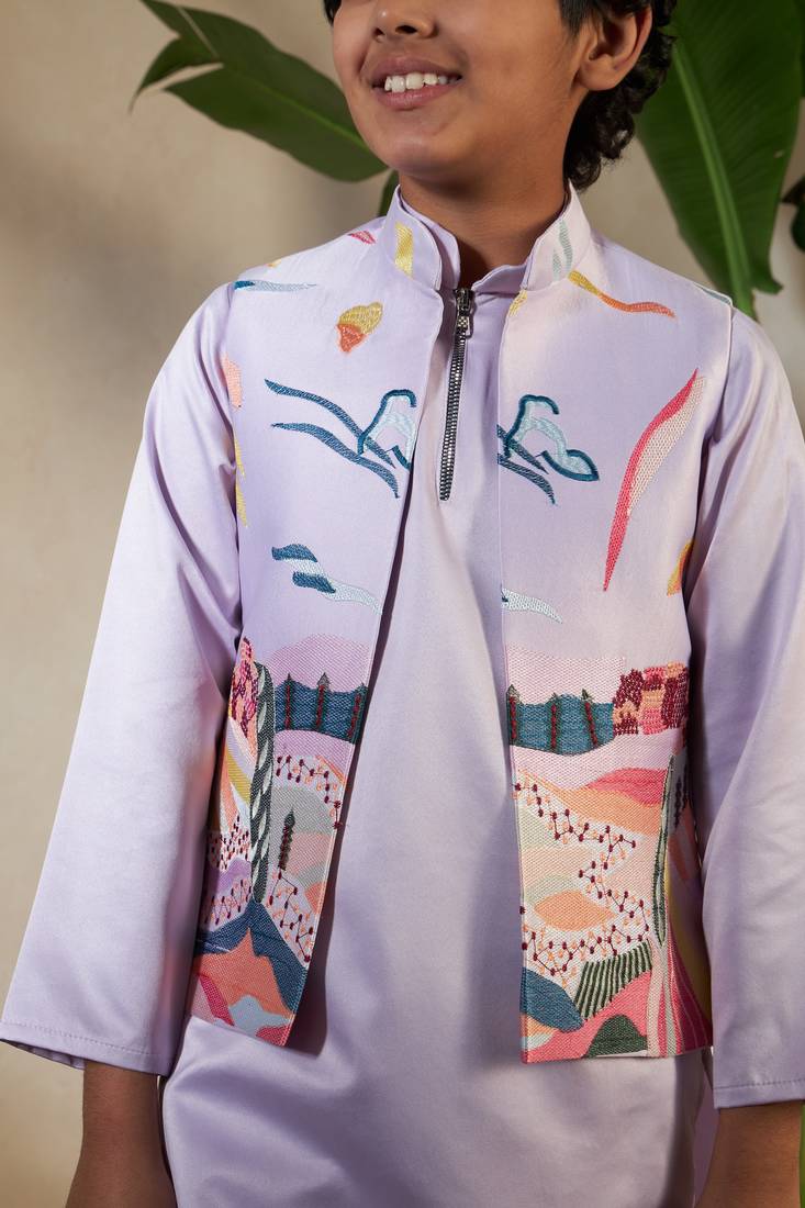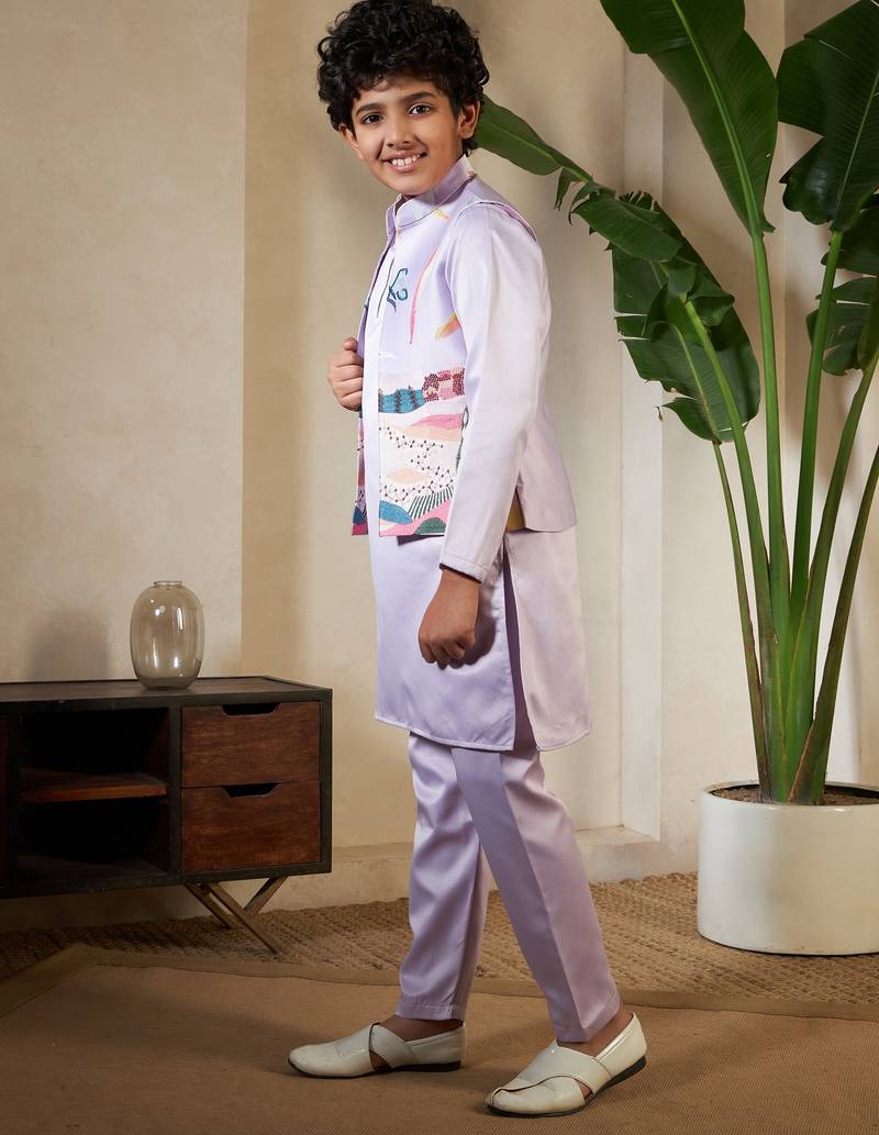| Product Name | Lavender Satin Thead With Sequins Embroidered Work Wedding Function Festival Party Boys Straight Kurta Pant Koti | |