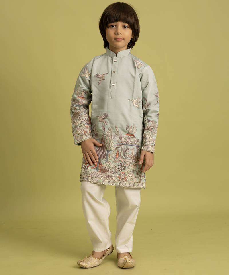 Pista green viscose silk thread embroidered boys kurta pajama