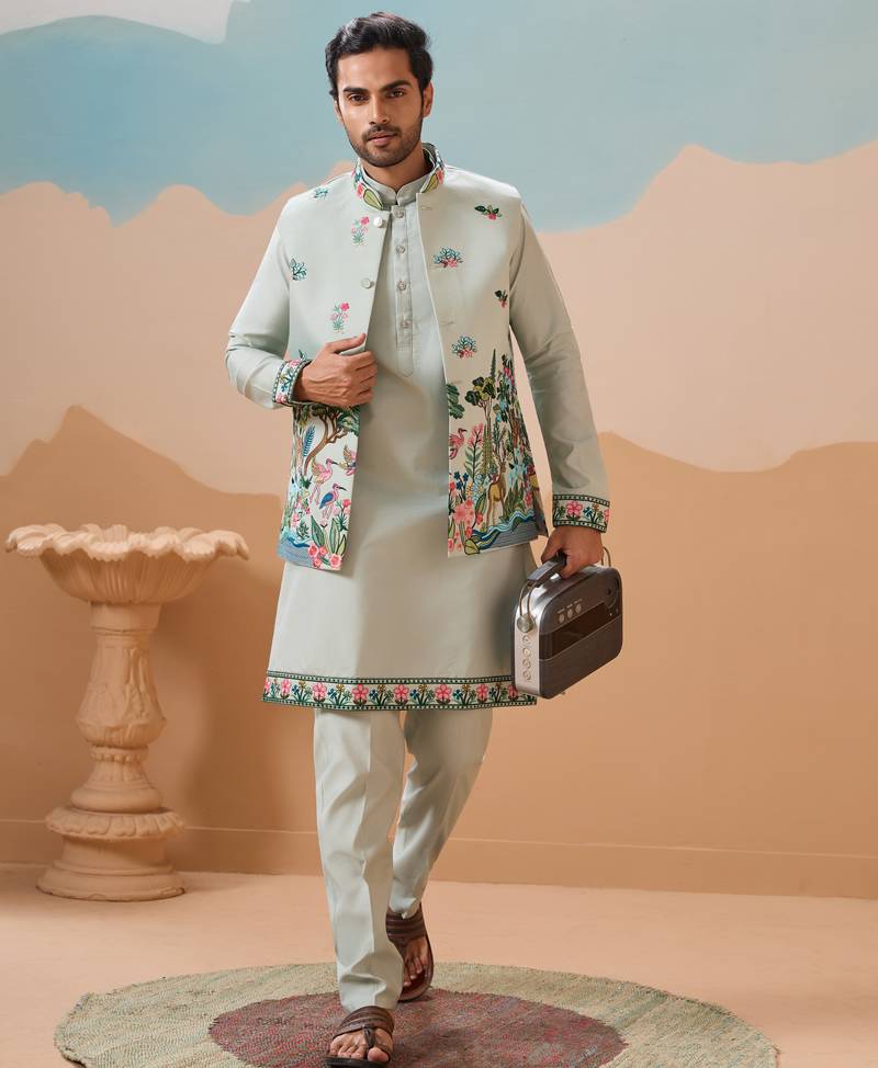 | Product Name | Pista Green Viscose Silk Thread Sequins Embroidered Work Wedding Festival Party Wear Straight Kurta With Jacke And Pant | |