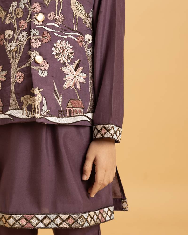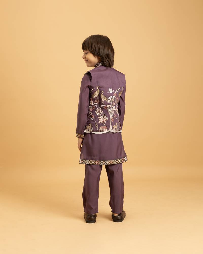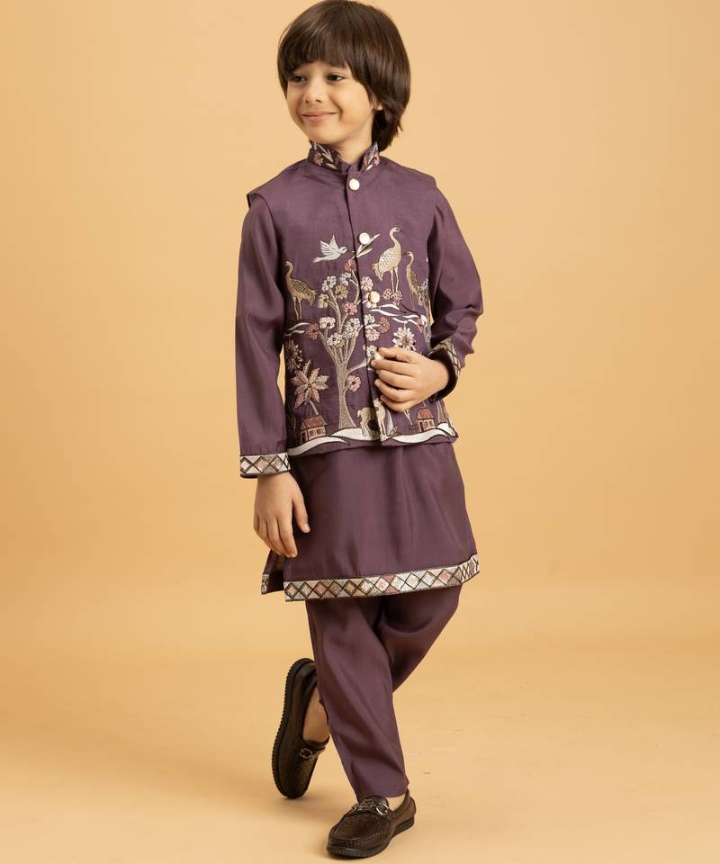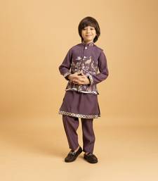 | Product Name | Purple Viscose Silk Thead With Sequins Embroidered Work Wedding Function Festival Party Boys Straight Kurta Pant Koti | |