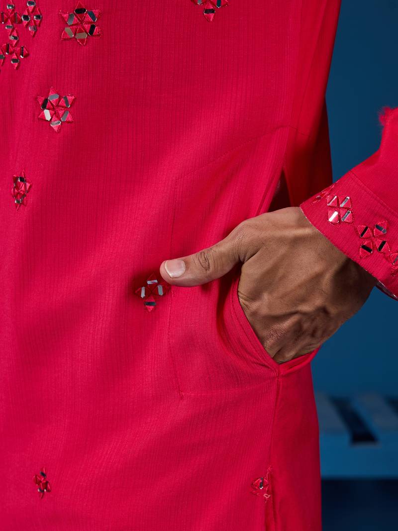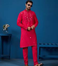 Rani viscose silk real mirror with thread embroidered work festival marriage party wear straight mens kurta with pant