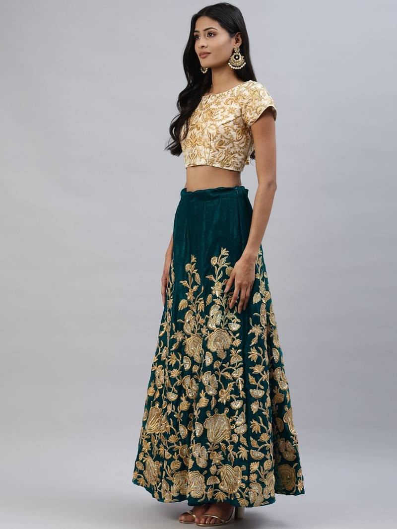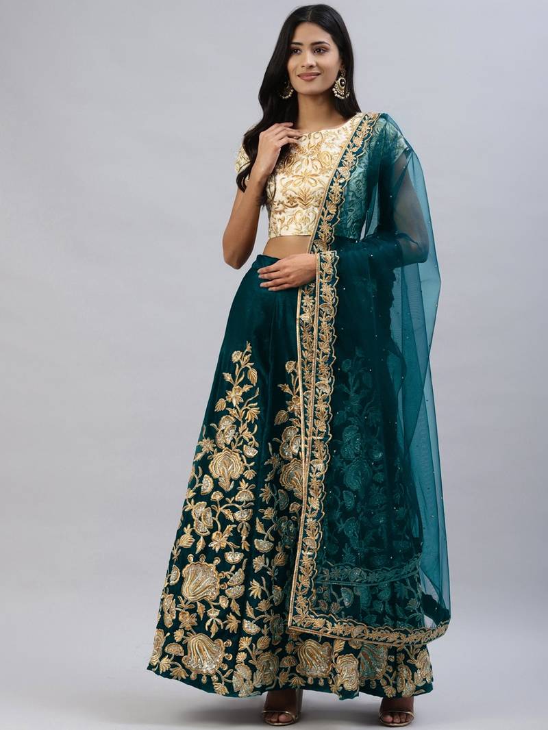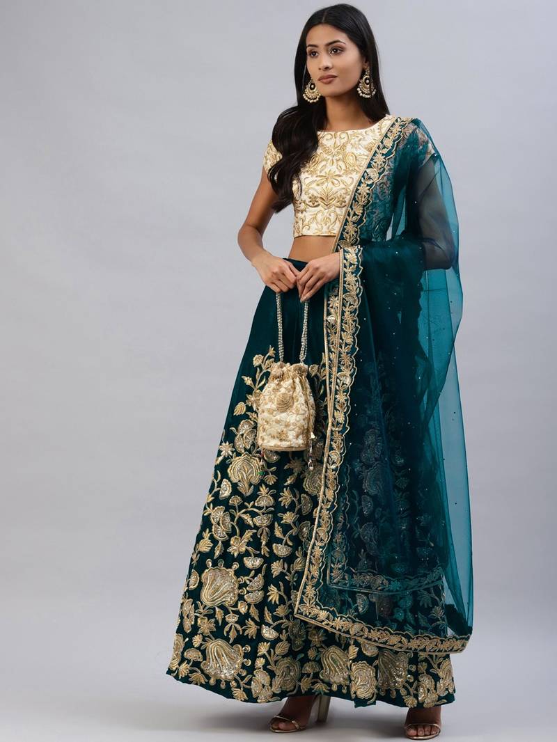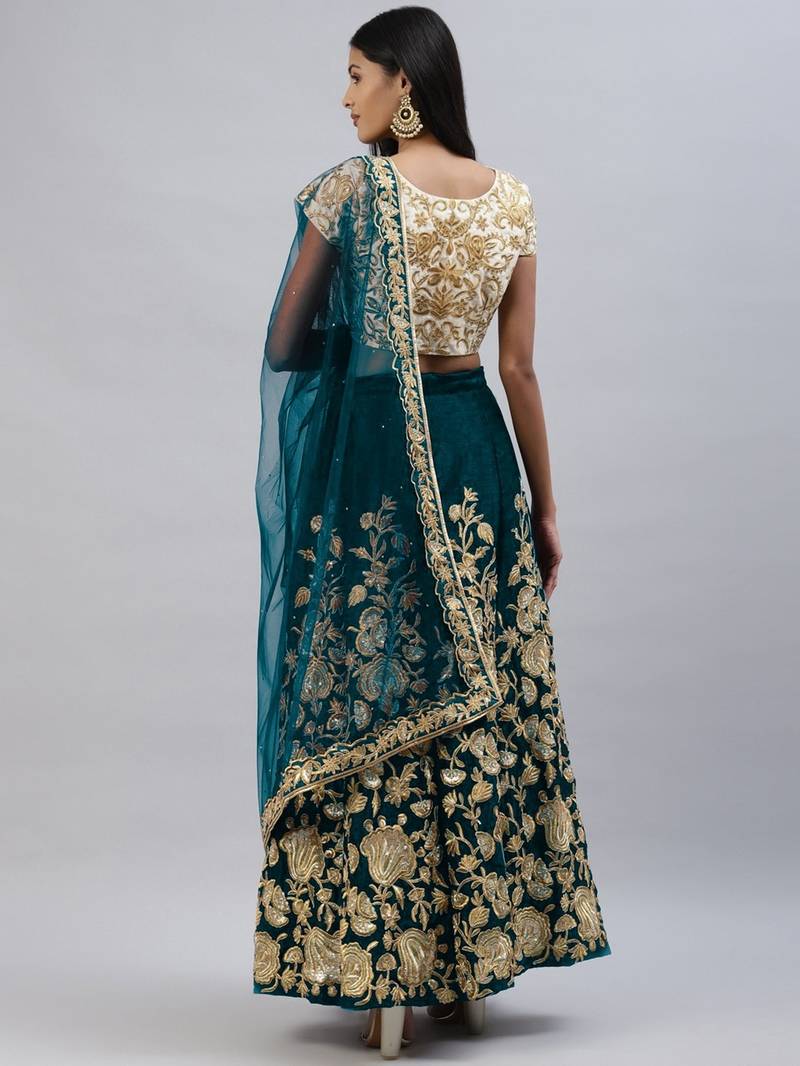 Turquoise zari dori & sequins embroidered velvet semi stitched lehenga choli