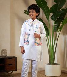 White satin thead with sequins embroidered work wedding function festival party boys straight kurta pant koti