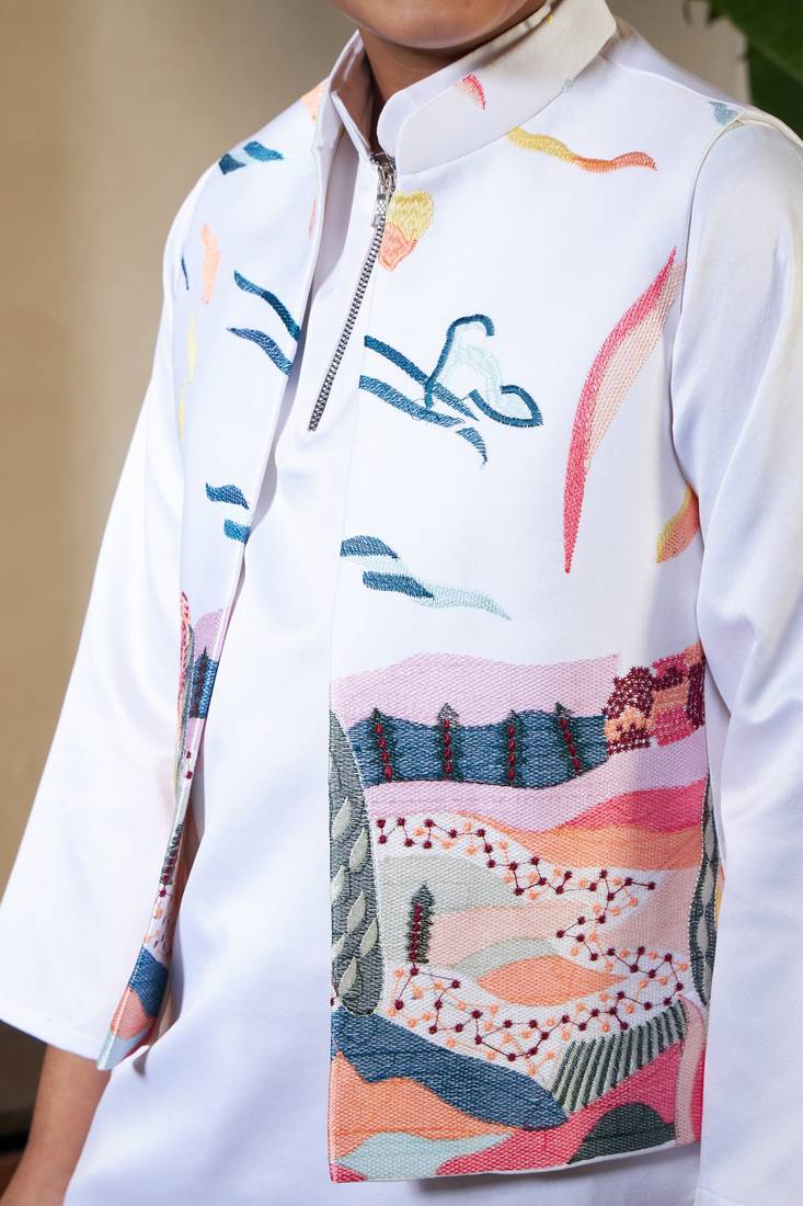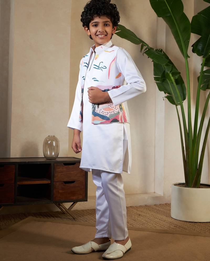 | Product Name | White Satin Thead With Sequins Embroidered Work Wedding Function Festival Party Boys Straight Kurta Pant Koti | |