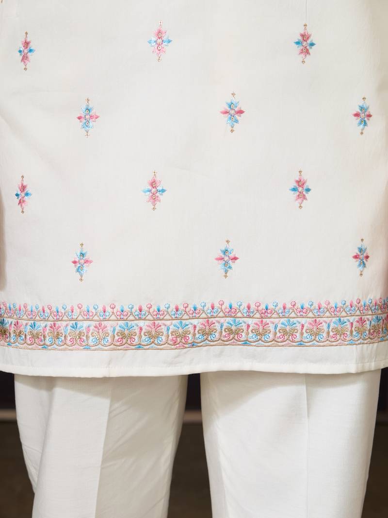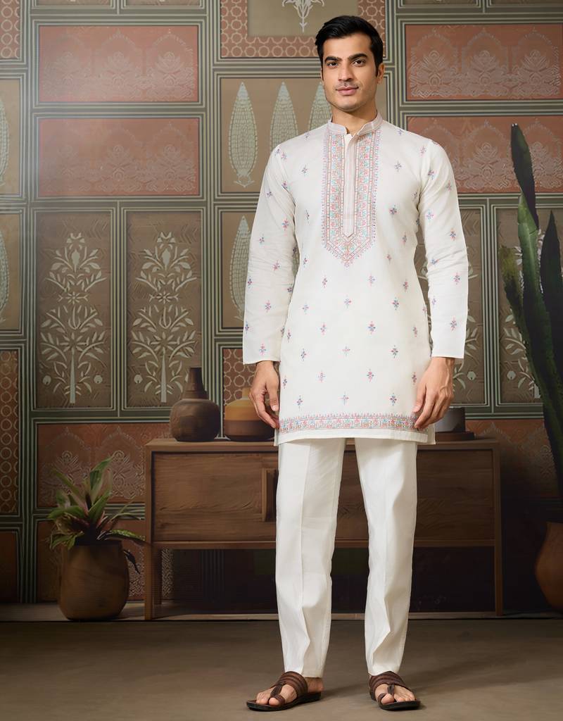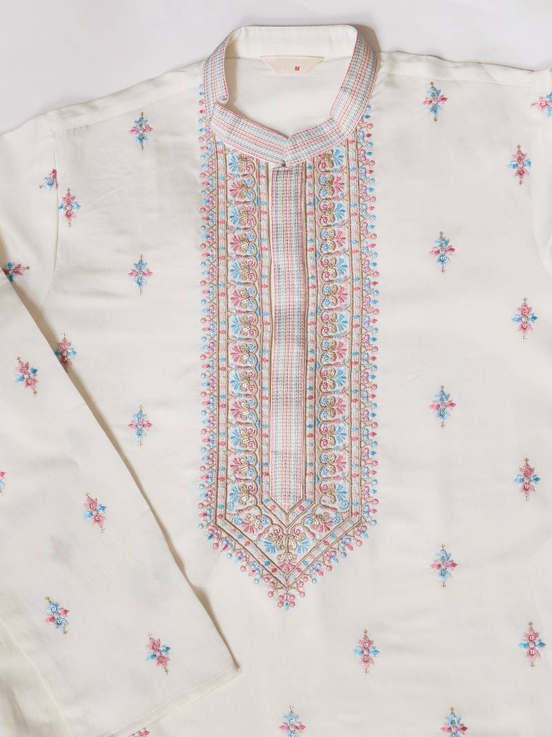 | Product Name | White Silk Premium Thread & Sequins Embroidered Work Wedding Festival Party Wear Straight Kurta With Jacke And Pant | |