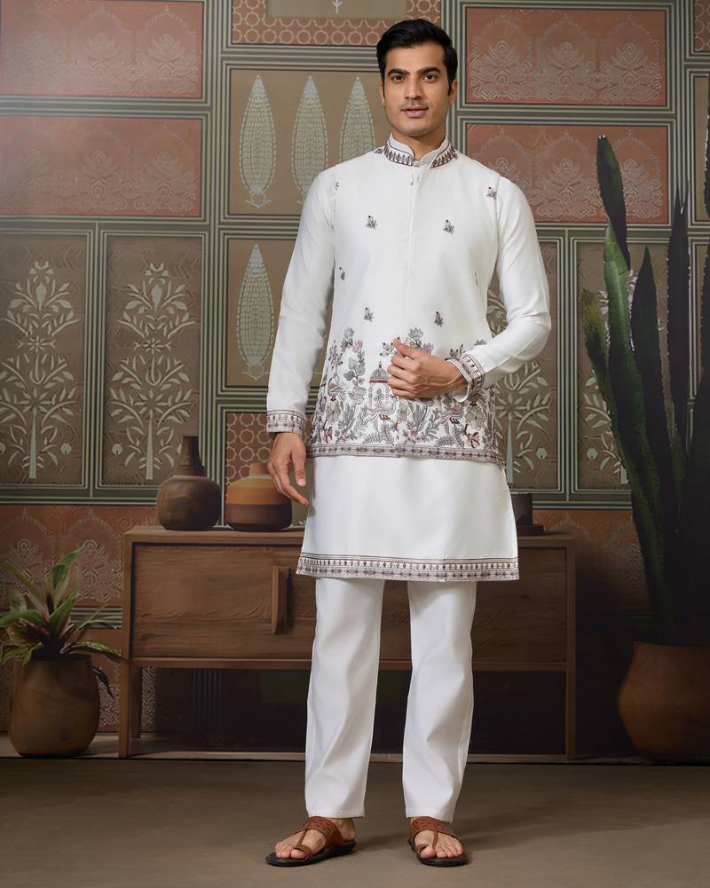 | Product Name | White Silk Premium Thread & Sequins Embroidered Work Wedding Festival Party Wear Straight Kurta With Jacke And Pant | |