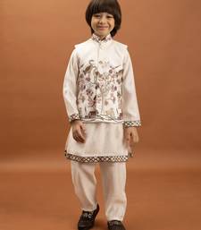 White viscose silk boys kurta pajama with embroidered jacket for festive wear