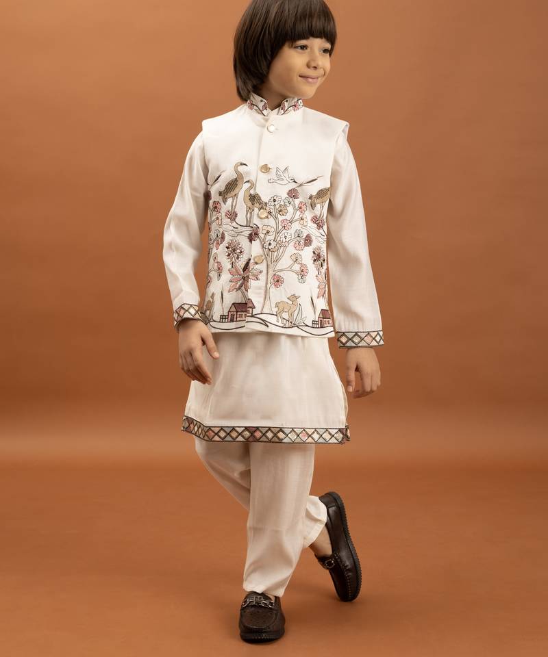 | Product Description | Dress Your Child In This White Boys Kurta Pajama Set Made From Soft Viscose Silk Fabric. The Outfit Is Paired With A Matching Jacket Featuring Intricate Thread Embroidery Inspired By Traditional Floral And Bird Motifs. Designed For Comfort And Style, This Kurta Pajama With Jacket Is A Perfect Choice For Festive Occasions, Weddings, And Cultural Celebrations. |