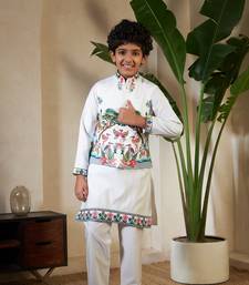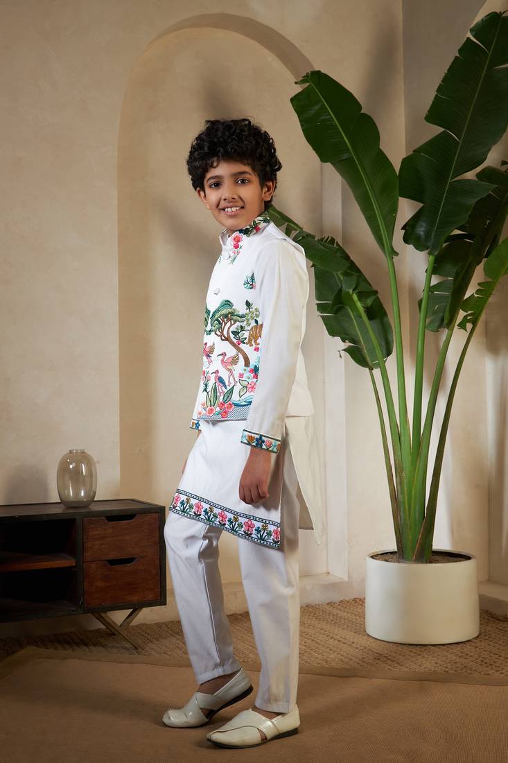 | Product Name | White Viscose Silk Thead With Sequins Embroidered Work Wedding Function Festival Party Boys Straight Kurta Pant Koti | |