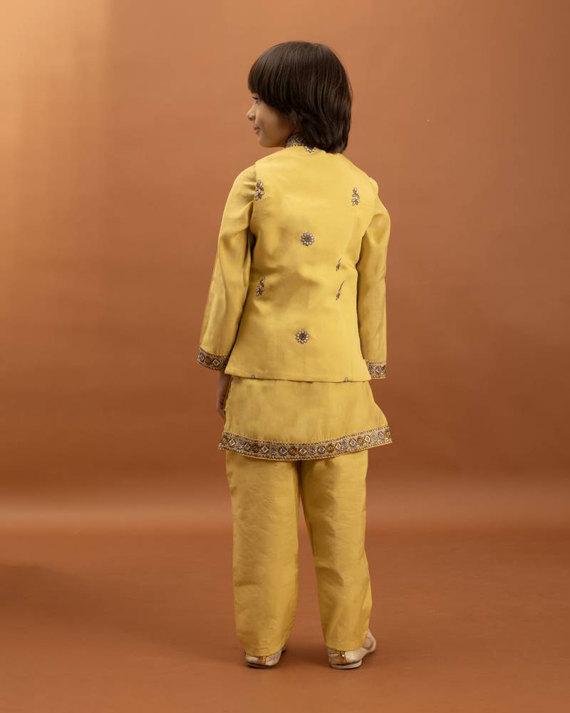 Yellow viscose silk nehru jacket set with sequins embroidered work