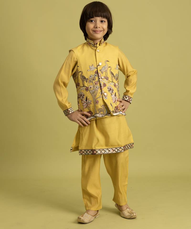 | Product Description | Dress Your Child In This Yellow Boys Kurta Pajama Set Made From Soft Viscose Silk Fabric. The Outfit Is Paired With A Matching Jacket Featuring Intricate Thread Embroidery Inspired By Traditional Floral And Bird Motifs. Designed For Comfort And Style, This Kurta Pajama With Jacket Is A Perfect Choice For Festive Occasions, Weddings, And Cultural Celebrations. |