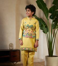 Yellow viscose silk thead with sequins embroidered work wedding function festival party boys straight kurta pant koti
