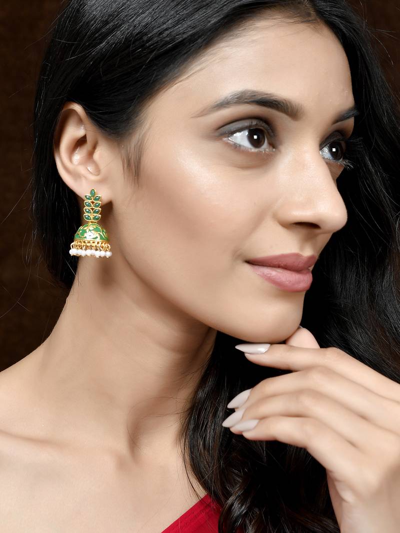 | Product Description | Women Gold Plated Green Floral Meenakari Designer Jhumkas Secured With Post And Back Closure. This Handcrafted Jhumkas Will Give Your Ethnic Attire A Gorgeous Look. |