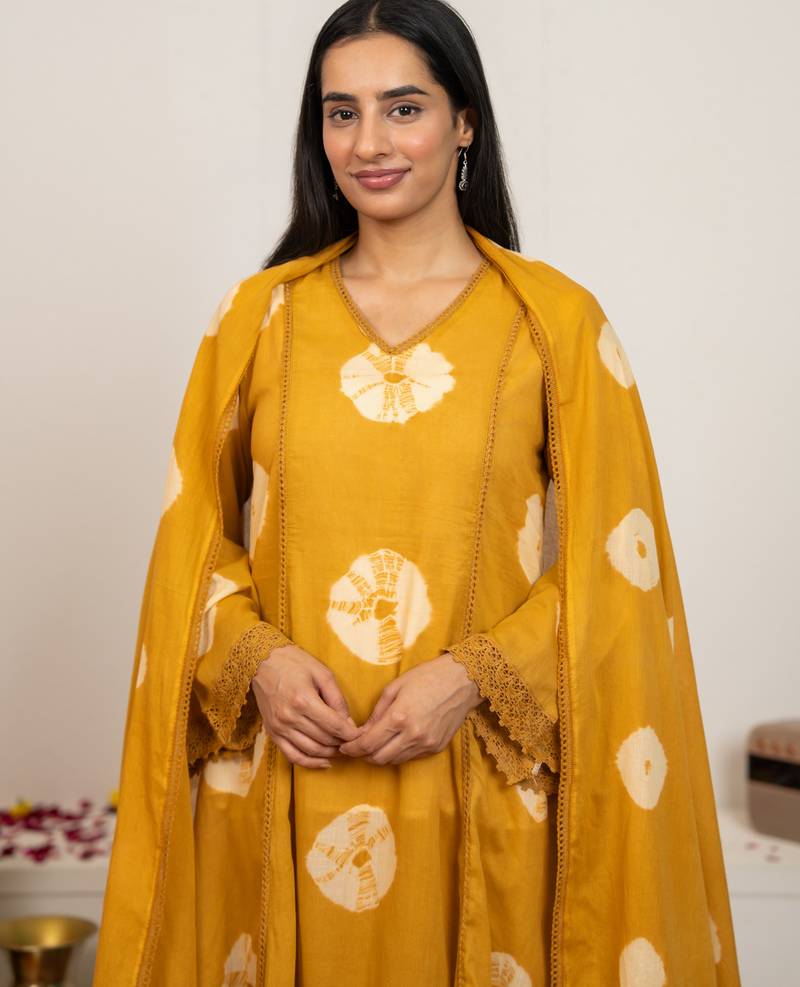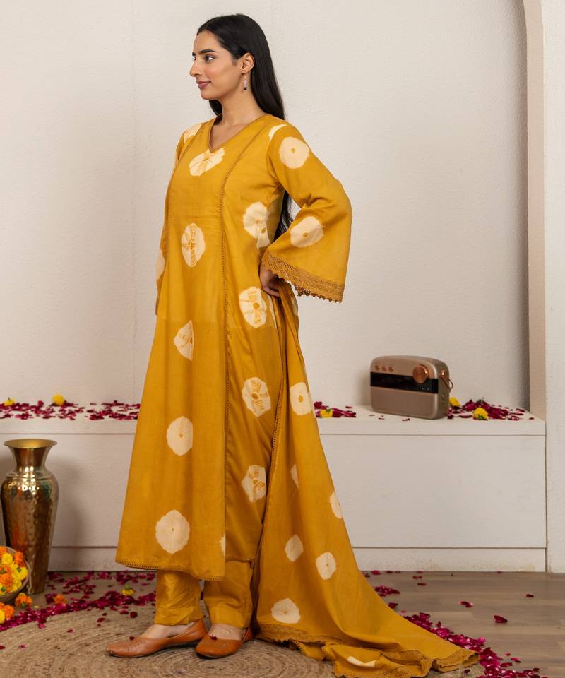 | Product Name | Mustard Yellow Tie & Dye Cotton Suit Set Of 3 | |