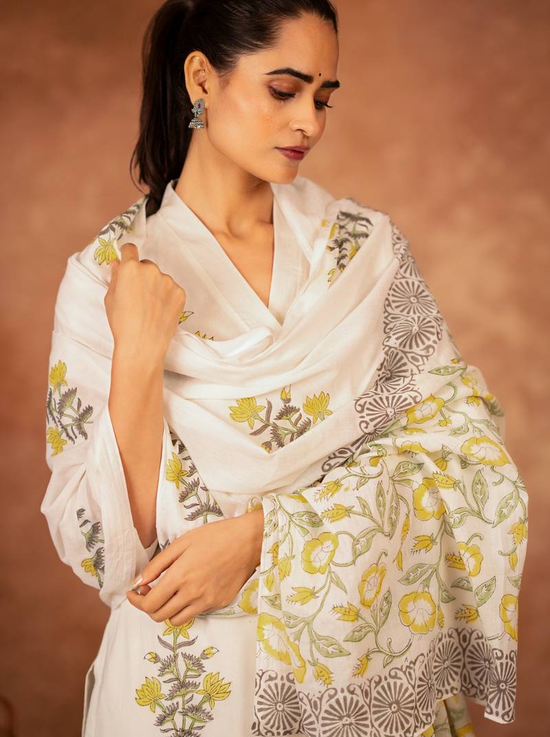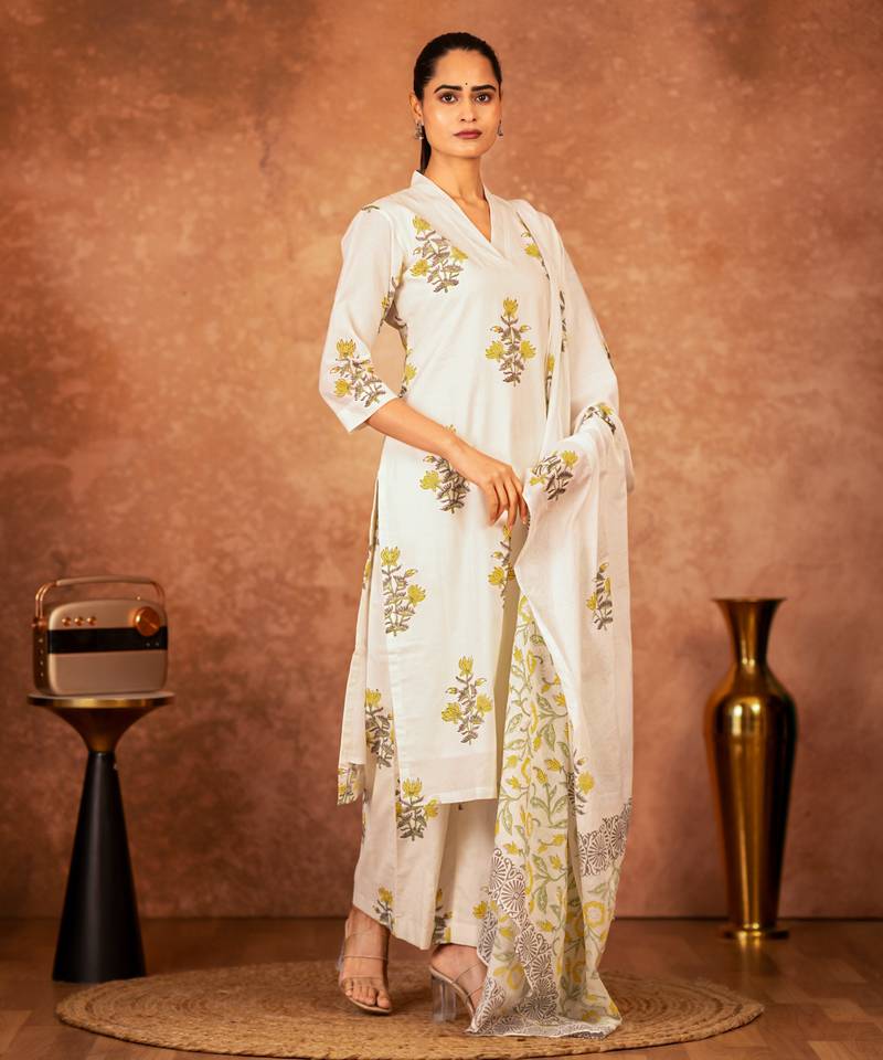 | Product Name | Off White Yellow Hand Block Printed Cotton Suit Set Of 3 | |