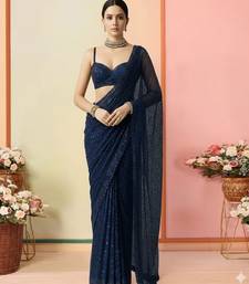 Blue embroidered net pre draped saree set