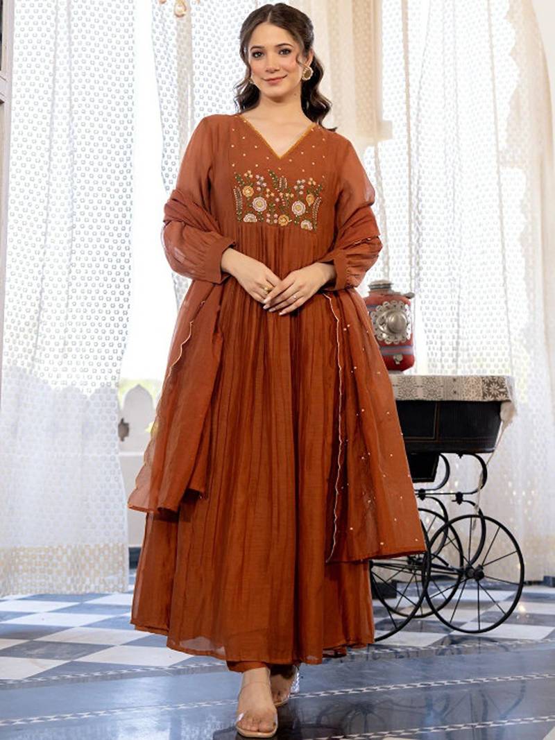 | Product Description | Rust Embroidered Kurta With Trousers With Dupatta Kurta Design: |
