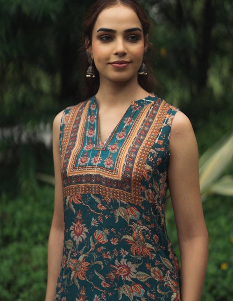 | Product Description | Teal Green & Brown & White Printed Kurta With Trousers Kurta Design: |