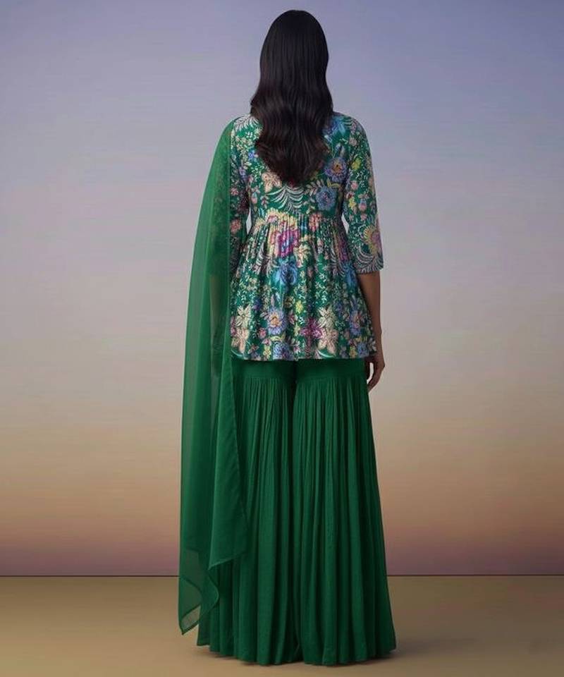 | Product Description | This Green Chinon Sharara Set Features Vibrant Prints That Create A Lively Ethnic Look. The Flowy Fabric Ensures Comfort While The Flared Silhouette Adds Elegance. Ideal For Festive Occasions, Cultural Gatherings, And Joyful Celebrations.