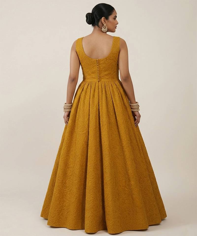 This Mustard Tissue Anarkali Set Features Intricate Embroidery That Enhances Its Festive Charm. The Lightweight Fabric Offers A Subtle Sheen And Graceful Flare, Creating An Elegant Silhouette. Perfect For Celebrations, It Pairs Beautifully With Traditional Jewelry, Delivering A Radiant And Sophisticated Look With Timeless Appeal.