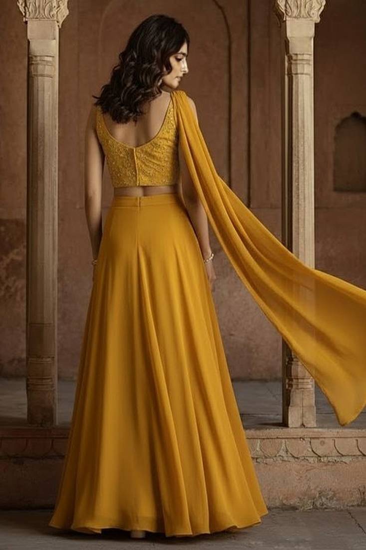Product Name Mustard Yellow Embroidered Georgette Lehenga Set