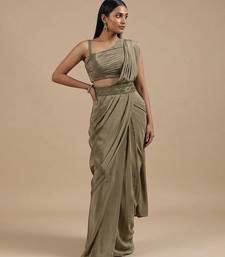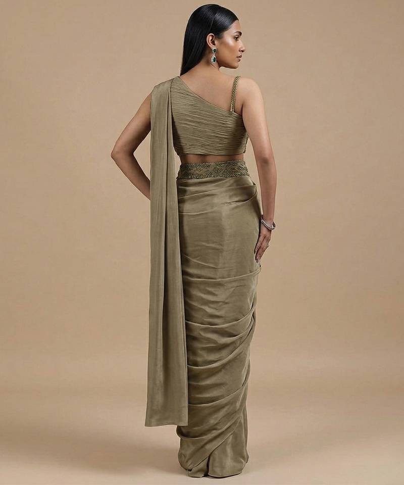 Olive green satin pre draped saree set