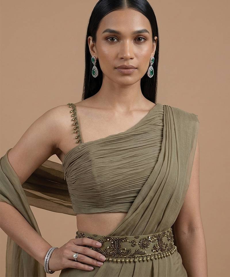 | Product Description | This Olive Green Satin Pre Draped Saree Set Offers A Luxurious Sheen And Smooth Texture. The Ready Silhouette Ensures Comfort And Effortless Styling. Ideal For Festive Occasions Or Evening Events, It Pairs Beautifully With Minimal Accessories For A Sophisticated And Contemporary Look.