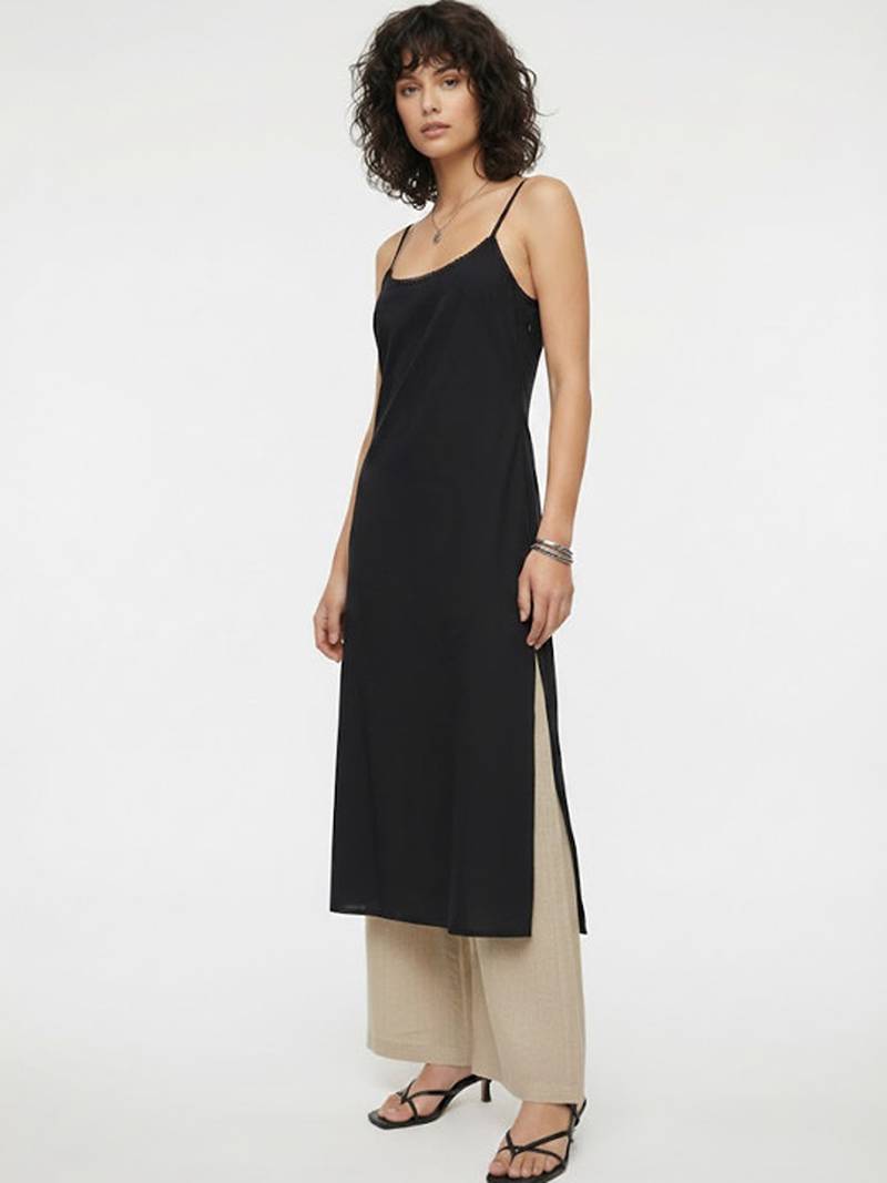 | Product Description | This Minimalist Black Kurta Is Defined By Its Clean, Straight Cut Silhouette And Delicate Shoulder Straps That Offer A Modern Twist On Traditional Wear. Crafted From Lightweight Fabric, The Side Slit Design Ensures Effortless Movement While Maintaining A Sharp, Elongated Profile. Color: Black Neckline: Shoulder Straps Sleeve Styling: Sleeveless, No Sleeves Length: Calf Disclaimer: The Model Is Ai Generated. |