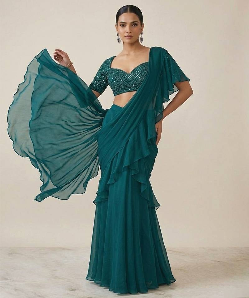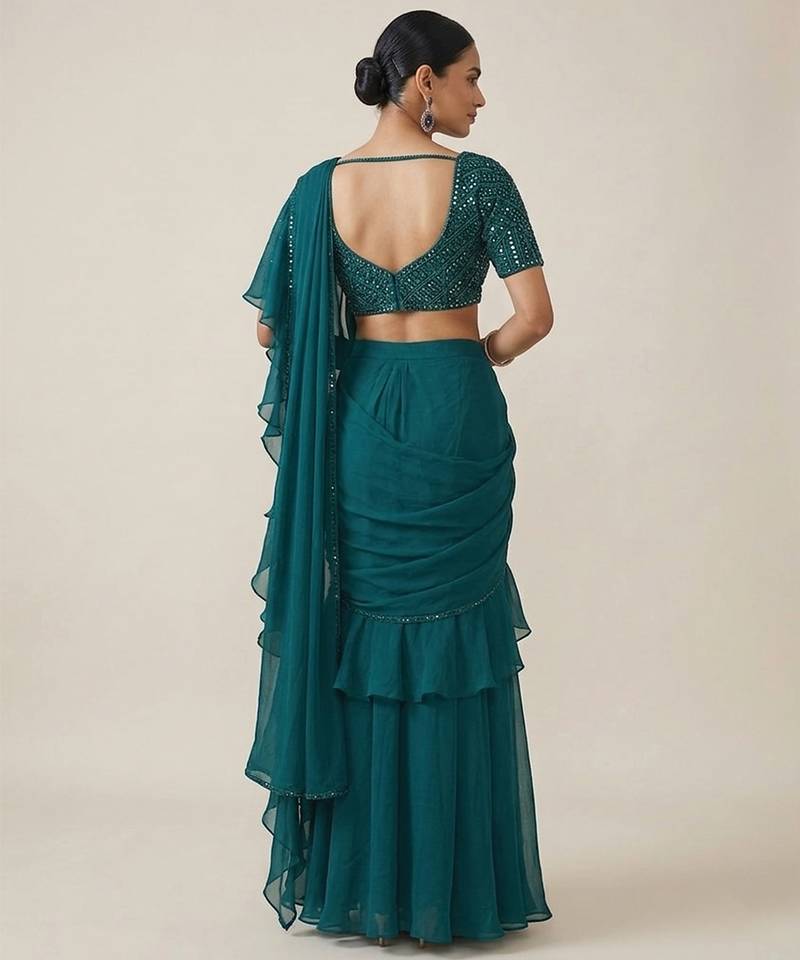 | Product Name | Teal Green Crepe Pre Draped Saree Set | |