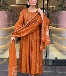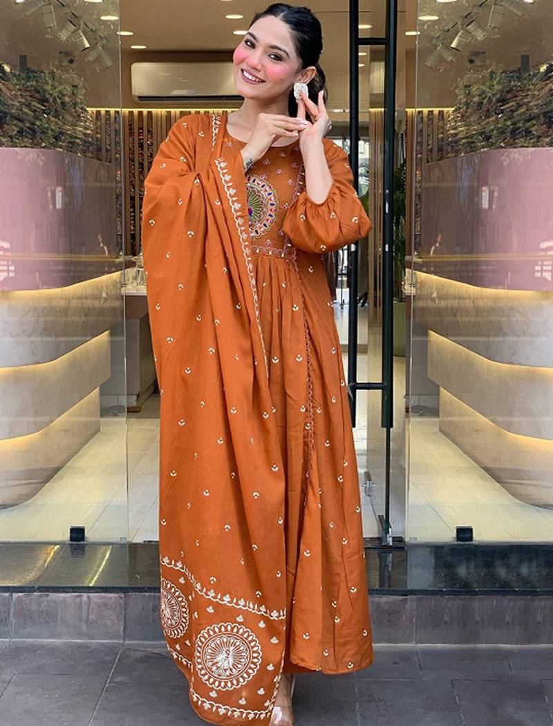| Product Description | Rust & White Embroidered Kurta With Trousers & Dupatta Woven Design Embroidered Rust Kurta Anarkali Shape Round Neck Three Quarter Sleeves Slip On Closure |