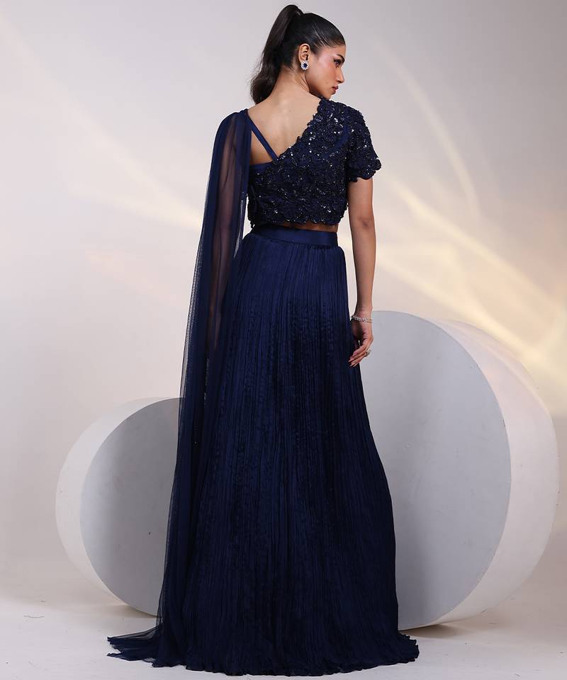 Elegant Blue Embroidered Chiffon Lehenga Set Featuring A Delicately Embellished Blouse, Flowing Pleated Skirt, And Sheer Dupatta. Lightweight Chiffon Drapes Gracefully, Offering Comfort And Movement. Perfect For Festive Occasions, Receptions, And Evening Celebrations, This Contemporary Ensemble Blends Refined Craftsmanship With Modern Sophistication And Timeless Charm For The Modern Woman Today.