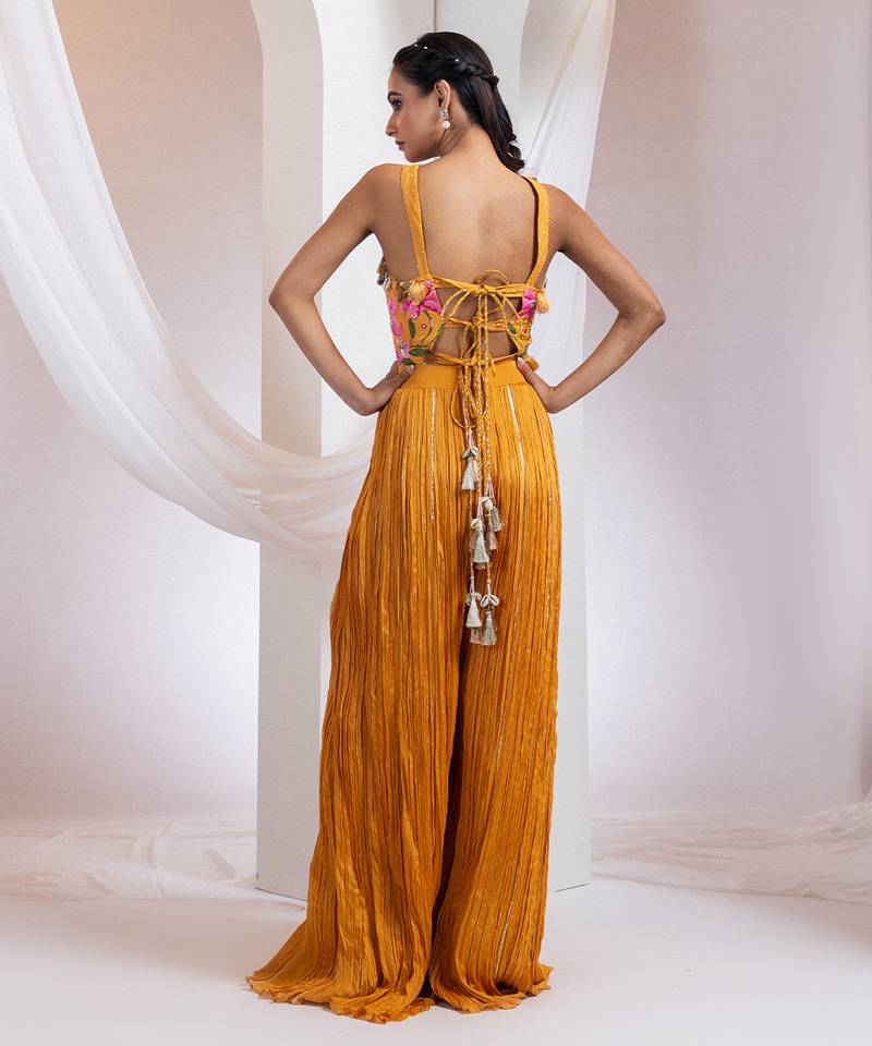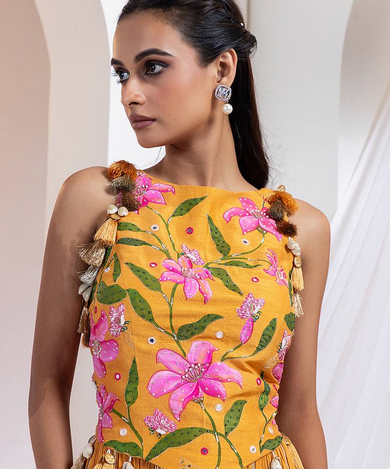 | Product Description | A Vibrant Two Piece Set Evoking The Spirit Of Spring In Full Flourish. The Structured Corset Top Is Hand Painted With Lush Pink And Green Florals, Enhanced With Sequins, Beads, And Delicate Mirror Work. Shell And Tassel Embellishments Add A Bohemian Charm, While The Flared Ruched Pants Complete The Free Spirited Silhouette.