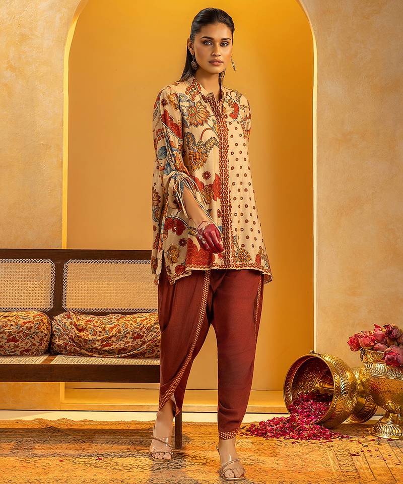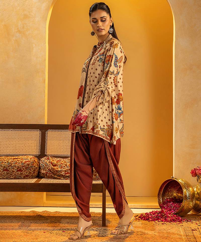 Product Description | Beige Rangtara Embellished Kurta With Gathered Sleeve, Paired With Dhoti Style Pants In Cotton Silk.
