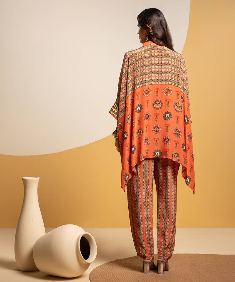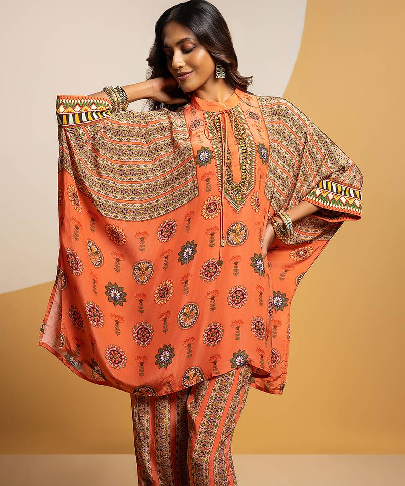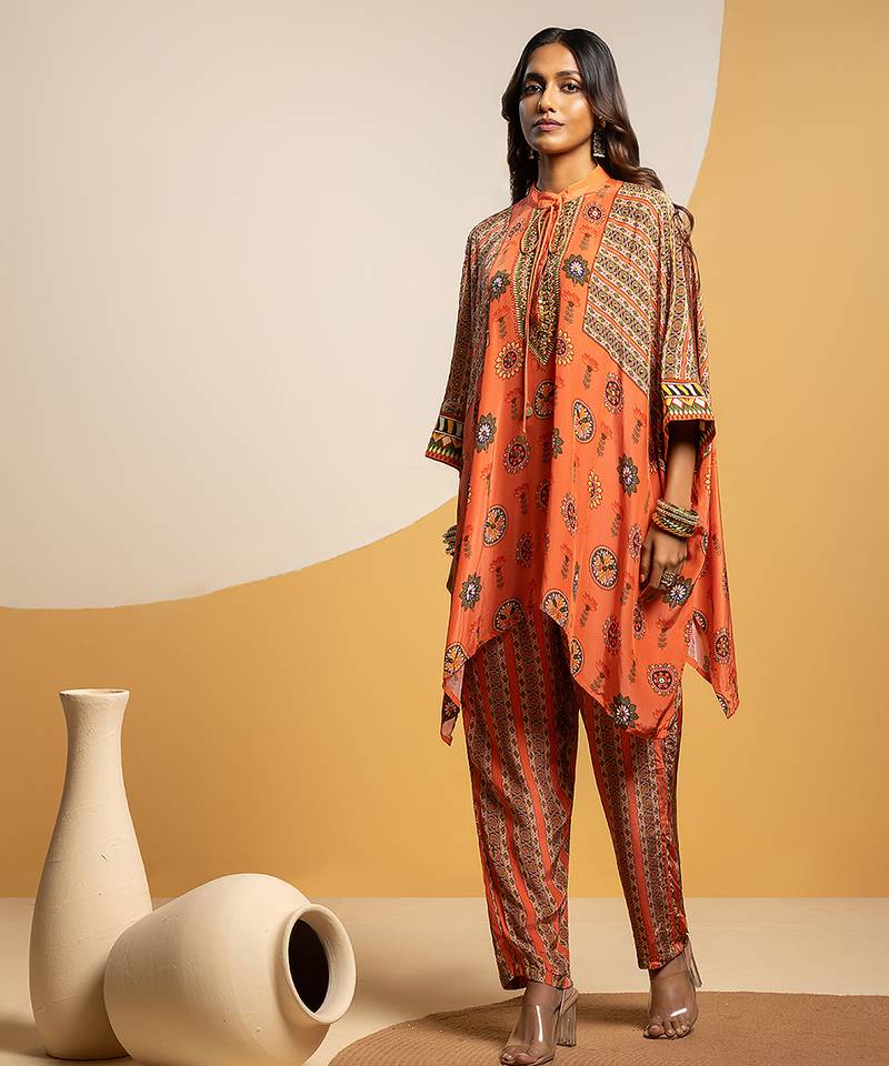 Product Description | Rust Taarani Embellished Kimono Kurta With Neck Tie Up, Paired With Printed Pants In Crepe.
