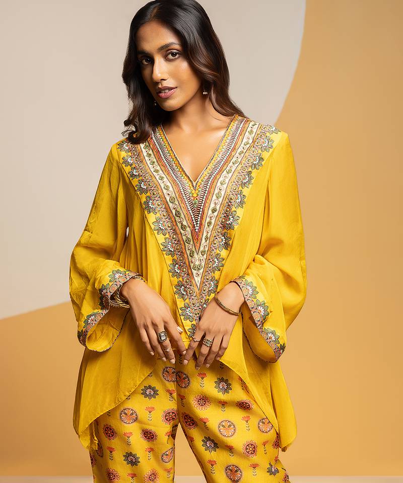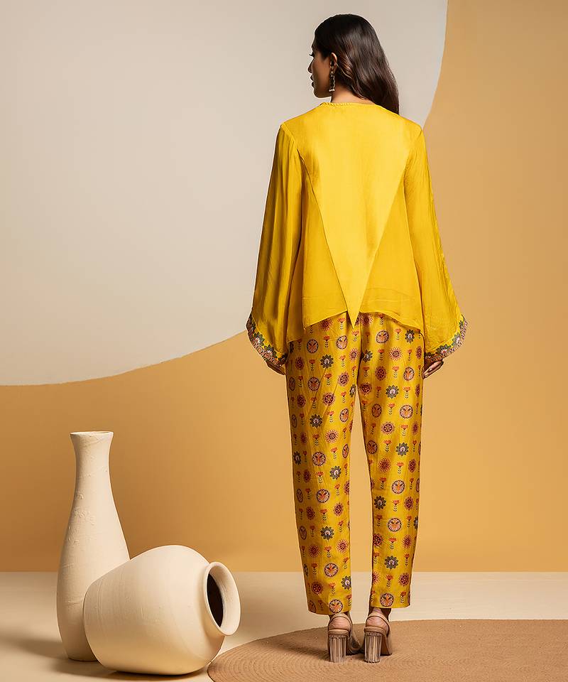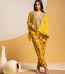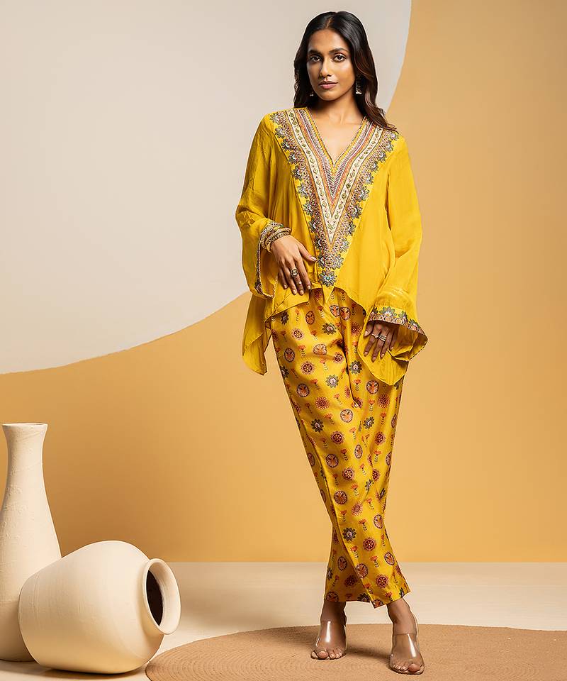 Product Description | Yellow Taarani Embellished V Neck Asymmetric Top, Paired With Printed Pants In Chanderi.