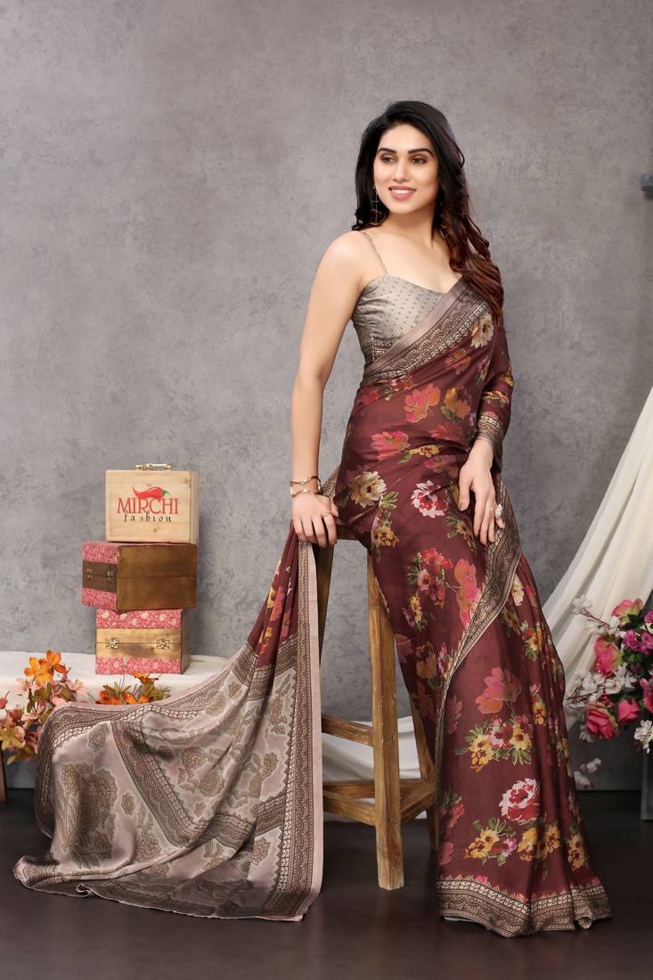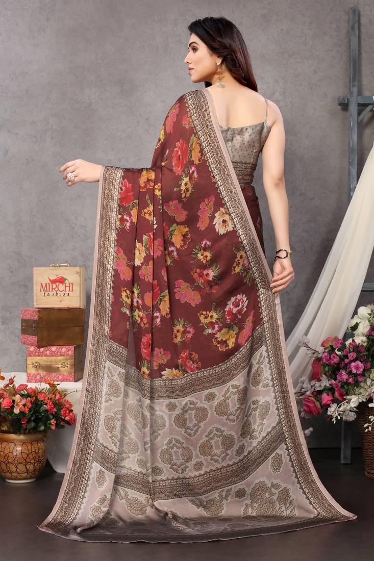 | Product Description | This Is A Maroon Color Beautifully Designed Indian Traditional Ethnic Festive Wear Sarees Made Of High Quality Fabric Chiffon Having Beautiful Flower Printed All Over Design With Printed Border. This Saree Is Ideal For Festivals, Occasional, Parties And Social/Friends/Family Get Together, Ceremonies Or Rituals, Business Functions Wherever You Want To Flaunt Your Style. Also Saree Design And Color Combination Are Suitable For Girls Or Women Of Across All Age Or Region. Comes With Taupe Color Un Stitched Blouse Piece. |