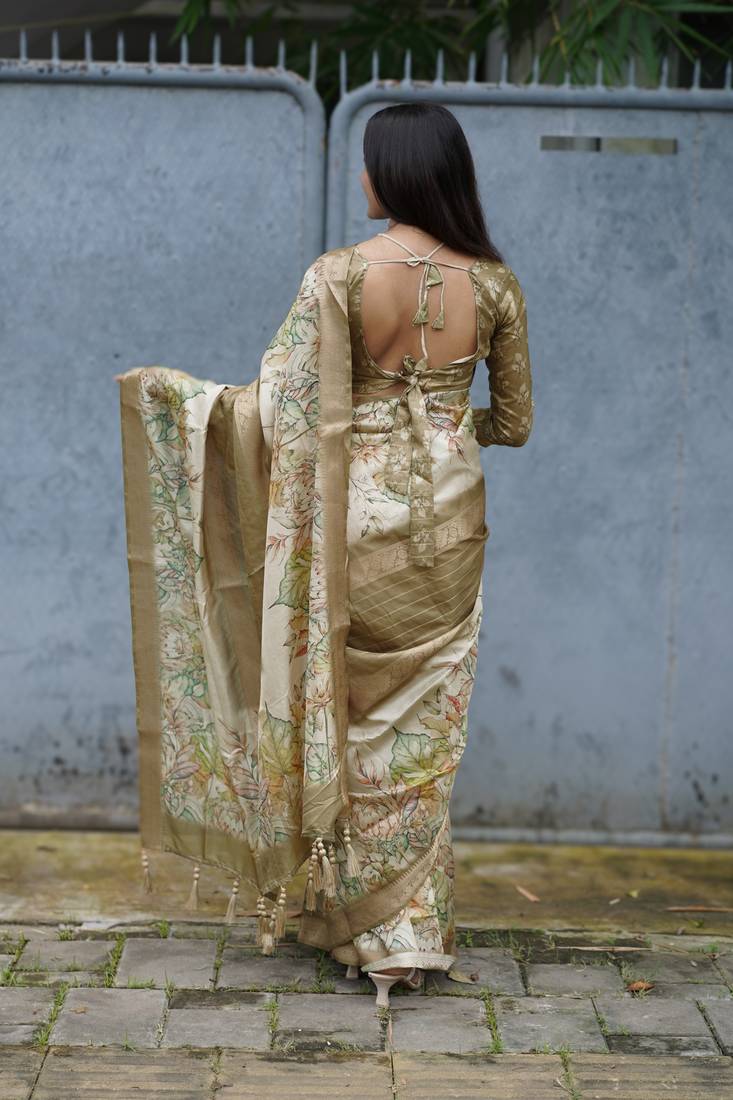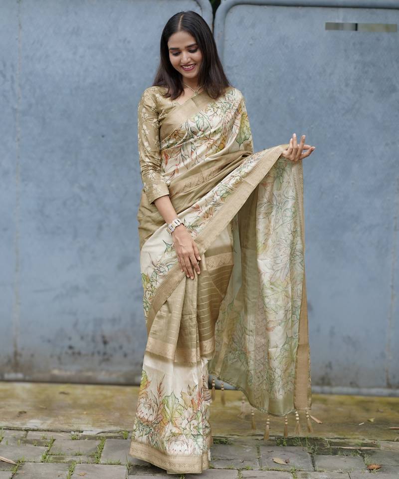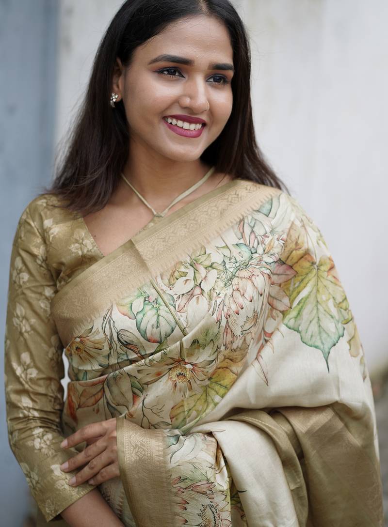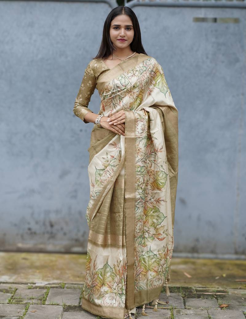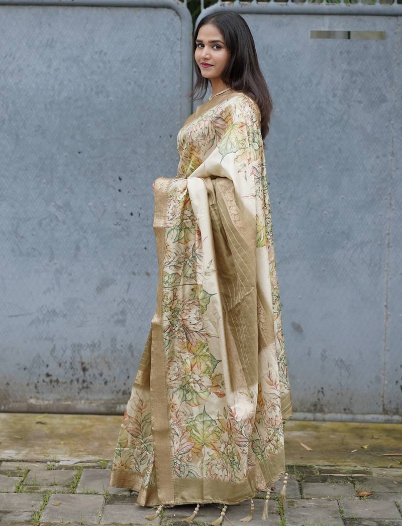 Beige floral print golden zari border cotton silk saree with unstiched blouse piece