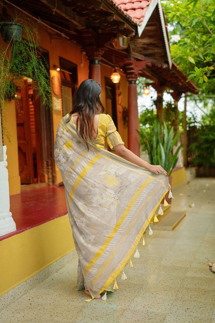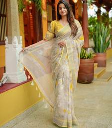 Product Name Beige Floral Print Zari Woven Border Cotton Blend Saree With Unstiched Blouse Piece