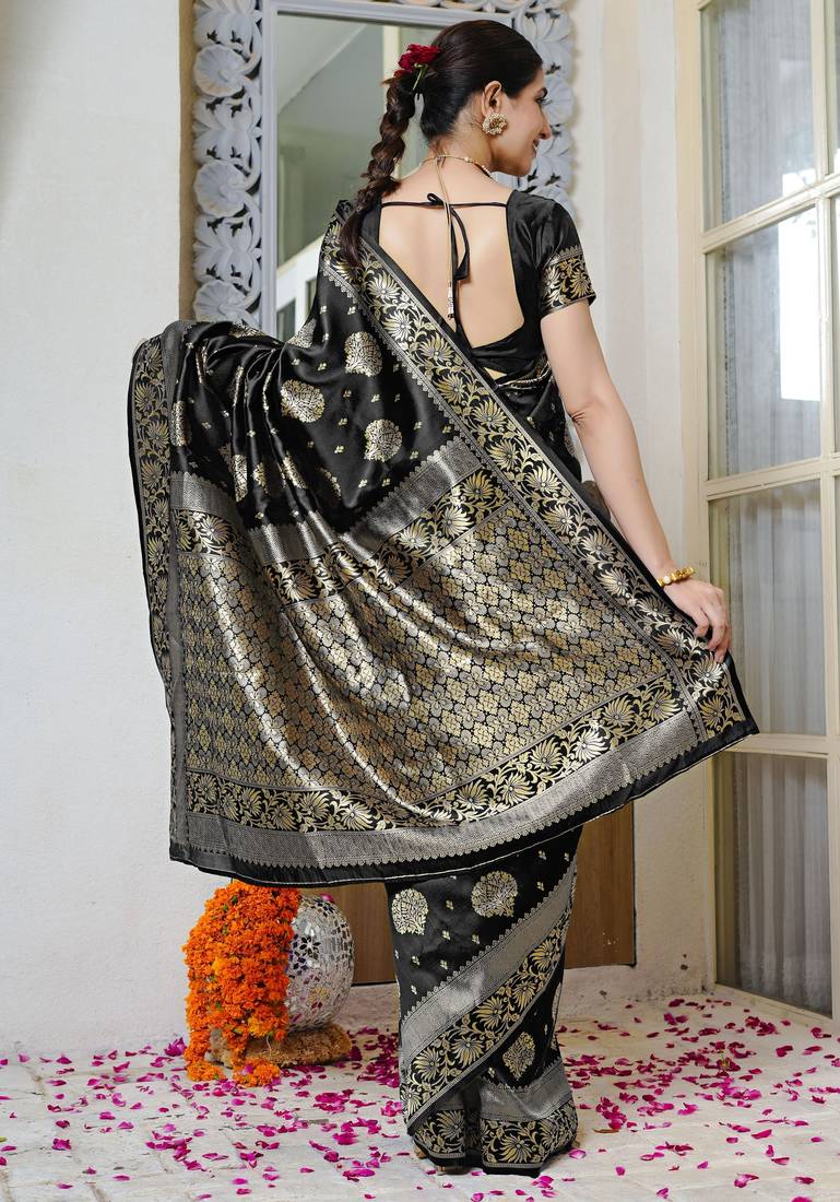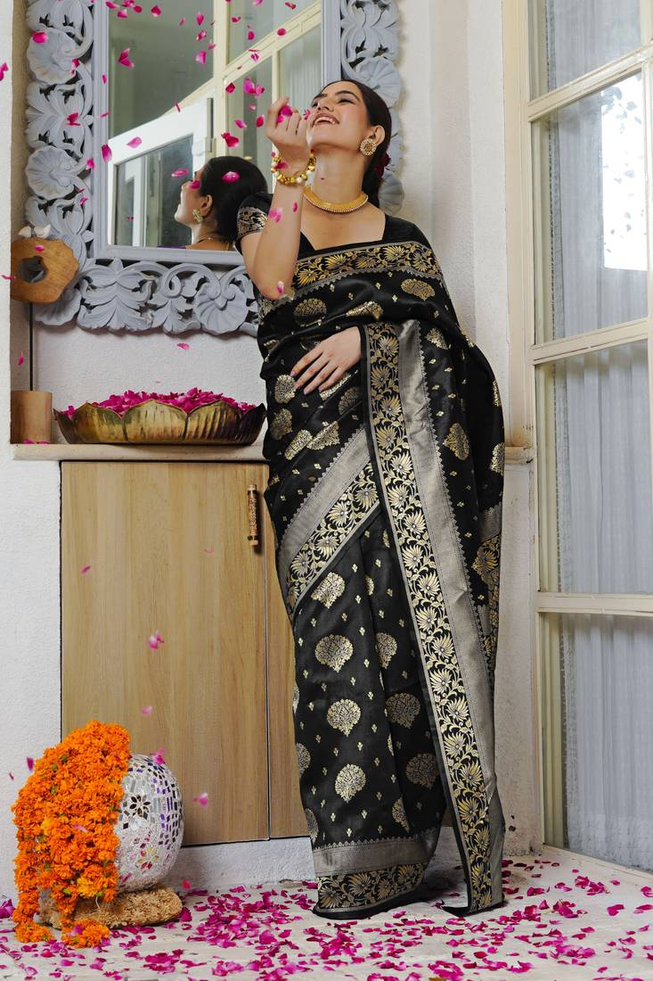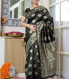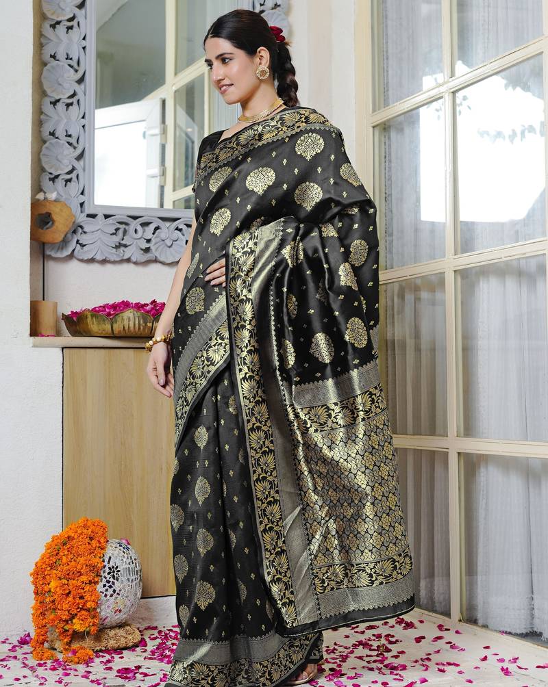 Black woven design golden zari border silk blend saree with unstiched blouse piece