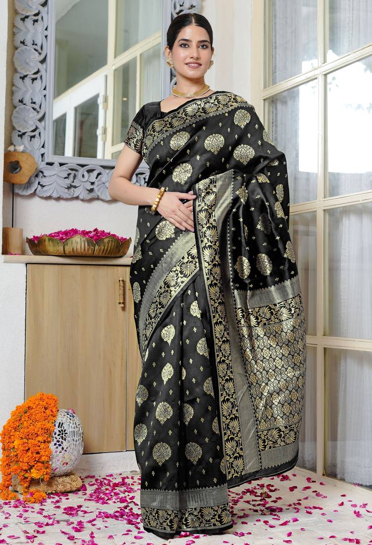 | Product Name | Black Woven Design Golden Zari Border Silk Blend Saree With Unstiched Blouse Piece | |