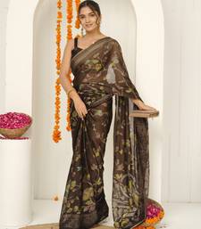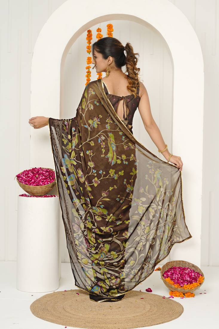 Brown floral foil print lace border chiffon saree with unstiched blouse piece