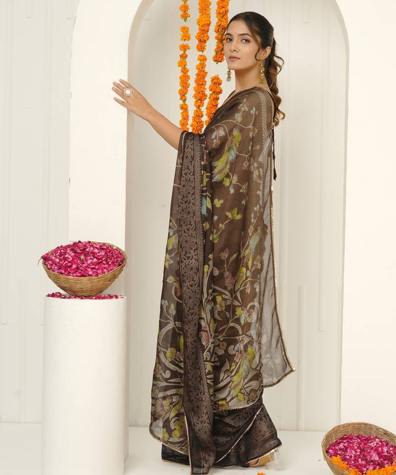 | Product Name | Brown Floral Foil Print Lace Border Chiffon Saree With Unstiched Blouse Piece | |