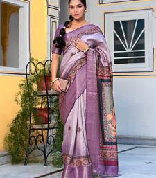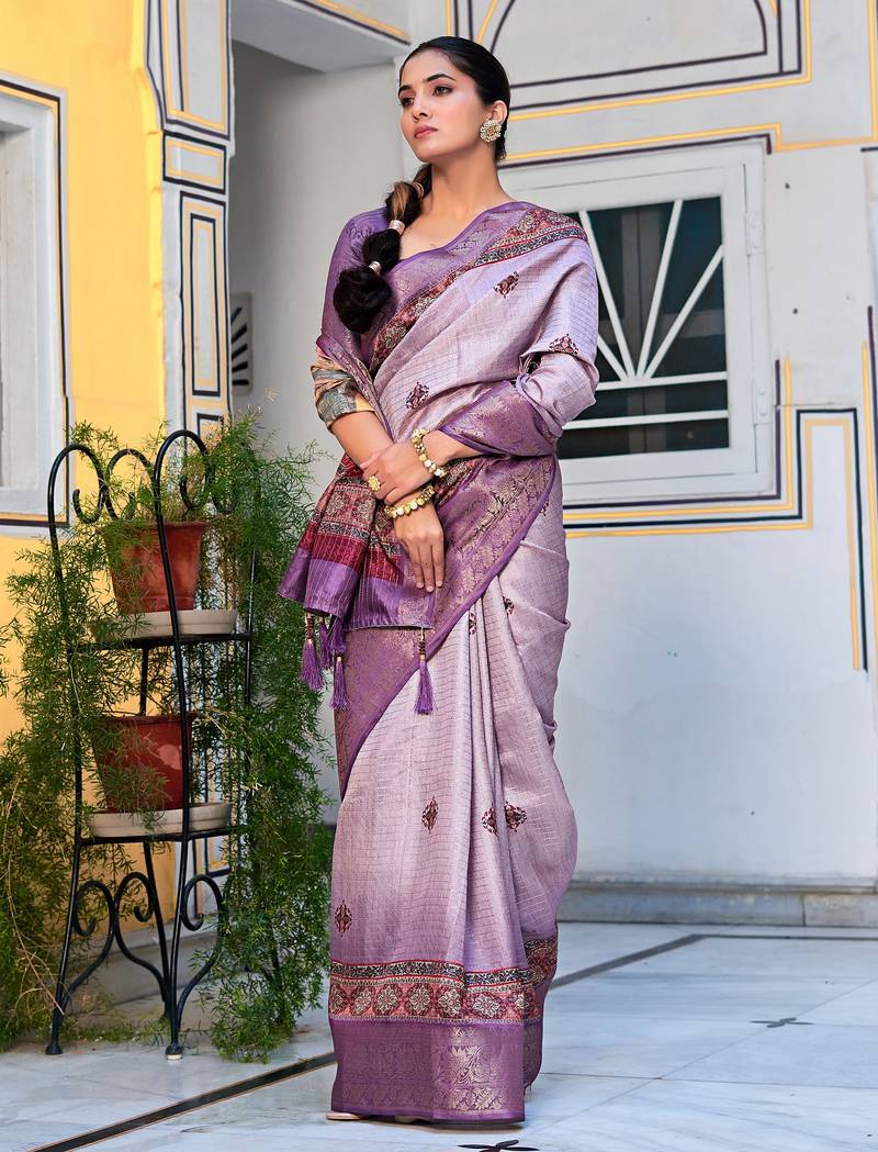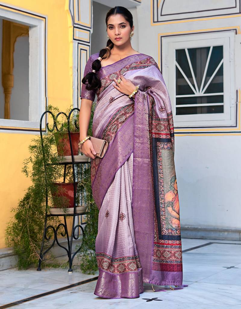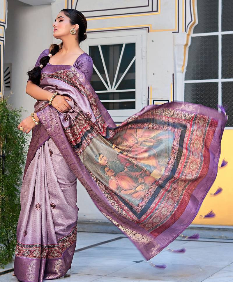 | Product Description | This Is A Light Dusty Lavender Beautifully Designed Indian Traditional Ethnic Party/Festive/ Wedding Wear Sarees Made Of High Quality Silk Blend Having Beautiful All Over Design Ajrakh/Human Figure Print/Kantha Work Zari Golden Weave Border With Tassles .This Saree Is A Ideal For Festivals, Parties And Social/Friends/Family Get Together, Ceremonies Or Rituals, Business Functions Wherever You Want To Flaunt Your Style. |