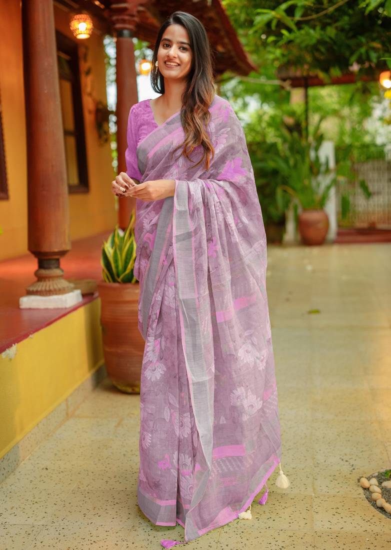 Product Name Lavender Floral Print Zari Woven Border Cotton Blend Saree With Unstiched Blouse Piece